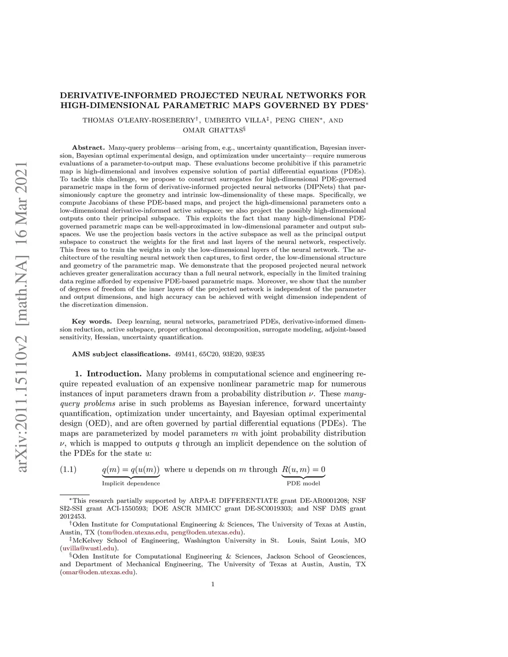 Many-query problems, arising from uncertainty quantification, Bayesian inversion, Bayesian optimal experimental design, and optimization under uncertainty-require numerous evaluations of a parameter-to-output map. These evaluations become prohibitive if this parametric map is high-dimensional and involves expensive solution of partial differential equations (PDEs). To tackle this challenge, we propose to construct surrogates for high-dimensional PDE-governed parametric maps in the form of projected neural networks that parsimoniously capture the geometry and intrinsic low-dimensionality of these maps. Specifically, we compute Jacobians of these PDE-based maps, and project the high-dimensional parameters onto a low-dimensional derivative-informed active subspace; we also project the possibly high-dimensional outputs onto their principal subspace. This exploits the fact that many high-dimensional PDE-governed parametric maps can be well-approximated in low-dimensional parameter and output subspace. We use the projection basis vectors in the active subspace as well as the principal output subspace to construct the weights for the first and last layers of the neural network, respectively. This frees us to train the weights in only the low-dimensional layers of the neural network. The architecture of the resulting neural network captures to first order, the low-dimensional structure and geometry of the parametric map. We demonstrate that the proposed projected neural network achieves greater generalization accuracy than a full neural network, especially in the limited training data regime afforded by expensive PDE-based parametric maps. Moreover, we show that the number of degrees of freedom of the inner layers of the projected network is independent of the parameter and output dimensions, and high accuracy can be achieved with weight dimension independent of the discretization dimension.