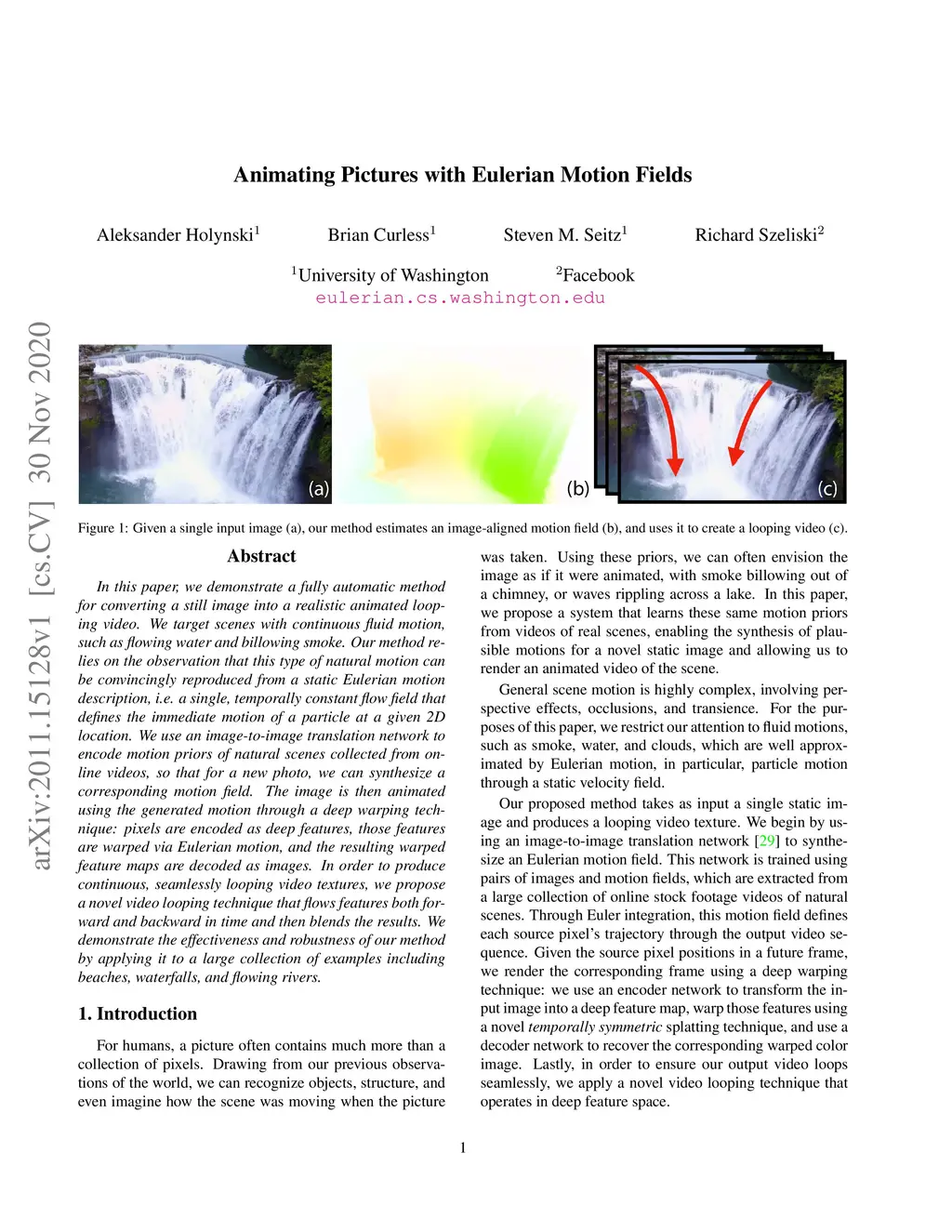 In this paper, we demonstrate a fully automatic method for converting a still image into a realistic animated looping video. We target scenes with continuous fluid motion, such as flowing water and billowing smoke. Our method relies on the observation that this type of natural motion can be convincingly reproduced from a static Eulerian motion description, i.e. a single, temporally constant flow field that defines the immediate motion of a particle at a given 2D location. We use an image-to-image translation network to encode motion priors of natural scenes collected from online videos, so that for a new photo, we can synthesize a corresponding motion field. The image is then animated using the generated motion through a deep warping technique: pixels are encoded as deep features, those features are warped via Eulerian motion, and the resulting warped feature maps are decoded as images. In order to produce continuous, seamlessly looping video textures, we propose a novel video looping technique that flows features both forward and backward in time and then blends the results. We demonstrate the effectiveness and robustness of our method by applying it to a large collection of examples including beaches, waterfalls, and flowing rivers.