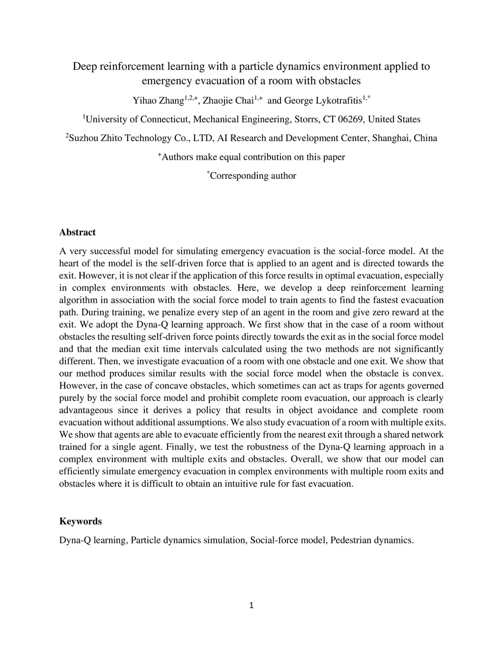 A very successful model for simulating emergency evacuation is the social-force model. At the heart of the model is the self-driven force that is applied to an agent and is directed towards the exit. However, it is not clear if the application of this force results in optimal evacuation, especially in complex environments with obstacles. Here, we develop a deep reinforcement learning algorithm in association with the social force model to train agents to find the fastest evacuation path. During training, we penalize every step of an agent in the room and give zero reward at the exit. We adopt the Dyna-Q learning approach. We first show that in the case of a room without obstacles the resulting self-driven force points directly towards the exit as in the social force model and that the median exit time intervals calculated using the two methods are not significantly different. Then, we investigate evacuation of a room with one obstacle and one exit. We show that our method produces similar results with the social force model when the obstacle is convex. However, in the case of concave obstacles, which sometimes can act as traps for agents governed purely by the social force model and prohibit complete room evacuation, our approach is clearly advantageous since it derives a policy that results in object avoidance and complete room evacuation without additional assumptions. We also study evacuation of a room with multiple exits. We show that agents are able to evacuate efficiently from the nearest exit through a shared network trained for a single agent. Finally, we test the robustness of the Dyna-Q learning approach in a complex environment with multiple exits and obstacles. Overall, we show that our model can efficiently simulate emergency evacuation in complex environments with multiple room exits and obstacles where it is difficult to obtain an intuitive rule for fast evacuation.