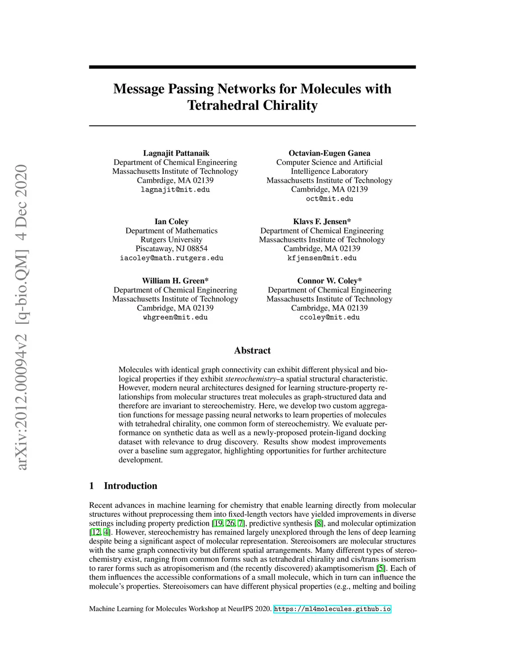 Molecules with identical graph connectivity can exhibit different physical and biological properties if they exhibit stereochemistry-a spatial structural characteristic. However, modern neural architectures designed for learning structure-property relationships from molecular structures treat molecules as graph-structured data and therefore are invariant to stereochemistry. Here, we develop two custom aggregation functions for message passing neural networks to learn properties of molecules with tetrahedral chirality, one common form of stereochemistry. We evaluate performance on synthetic data as well as a newly-proposed protein-ligand docking dataset with relevance to drug discovery. Results show modest improvements over a baseline sum aggregator, highlighting opportunities for further architecture development.