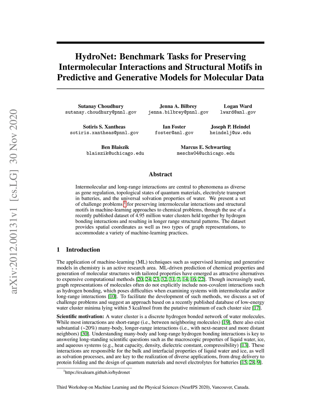 Intermolecular and long-range interactions are central to phenomena as diverse as gene regulation, topological states of quantum materials, electrolyte transport in batteries, and the universal solvation properties of water. We present a set of challenge problems for preserving intermolecular interactions and structural motifs in machine-learning approaches to chemical problems, through the use of a recently published dataset of 4.95 million water clusters held together by hydrogen bonding interactions and resulting in longer range structural patterns. The dataset provides spatial coordinates as well as two types of graph representations, to accommodate a variety of machine-learning practices.