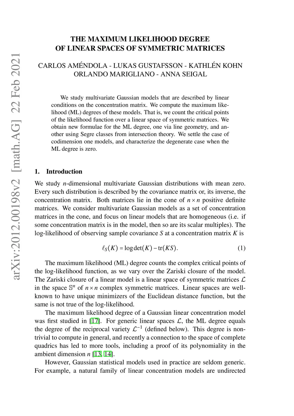 We study multivariate Gaussian models that are described by linear conditions on the concentration matrix. We compute the maximum likelihood (ML) degrees of these models. That is, we count the critical points of the likelihood function over a linear space of symmetric matrices. We obtain new formulae for the ML degree, one via Schubert calculus, and another using Segre classes from intersection theory. We settle the case of codimension one models, and characterize the degenerate case when the ML degree is zero.