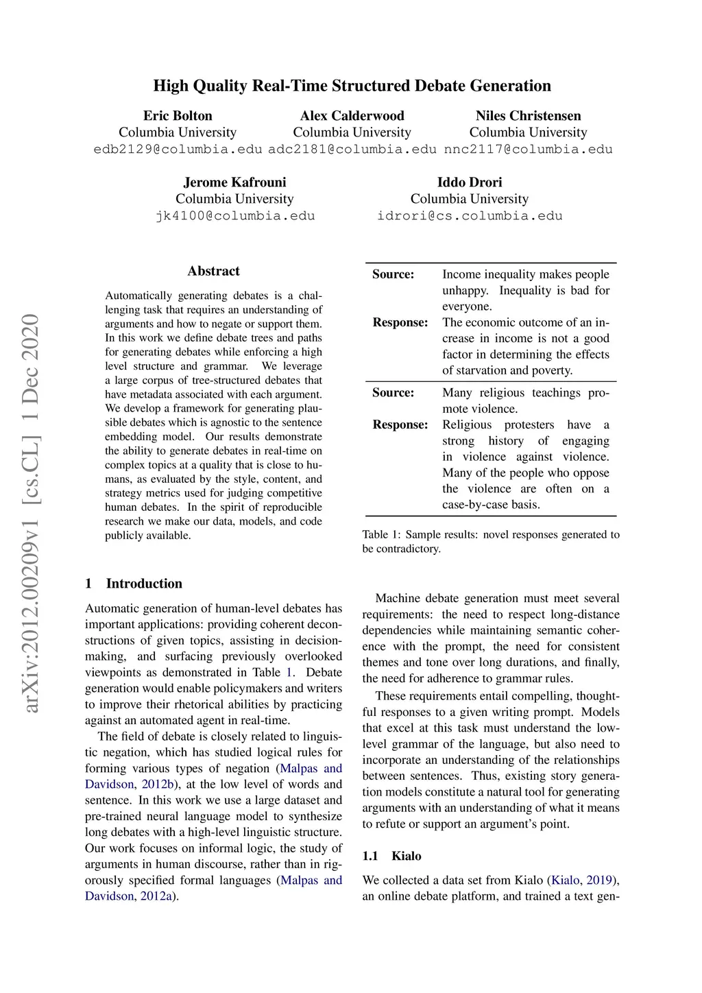 Automatically generating debates is a challenging task that requires an understanding of arguments and how to negate or support them. In this work we define debate trees and paths for generating debates while enforcing a high level structure and grammar. We leverage a large corpus of tree-structured debates that have metadata associated with each argument. We develop a framework for generating plausible debates which is agnostic to the sentence embedding model. Our results demonstrate the ability to generate debates in real-time on complex topics at a quality that is close to humans, as evaluated by the style, content, and strategy metrics used for judging competitive human debates. In the spirit of reproducible research we make our data, models, and code publicly available.