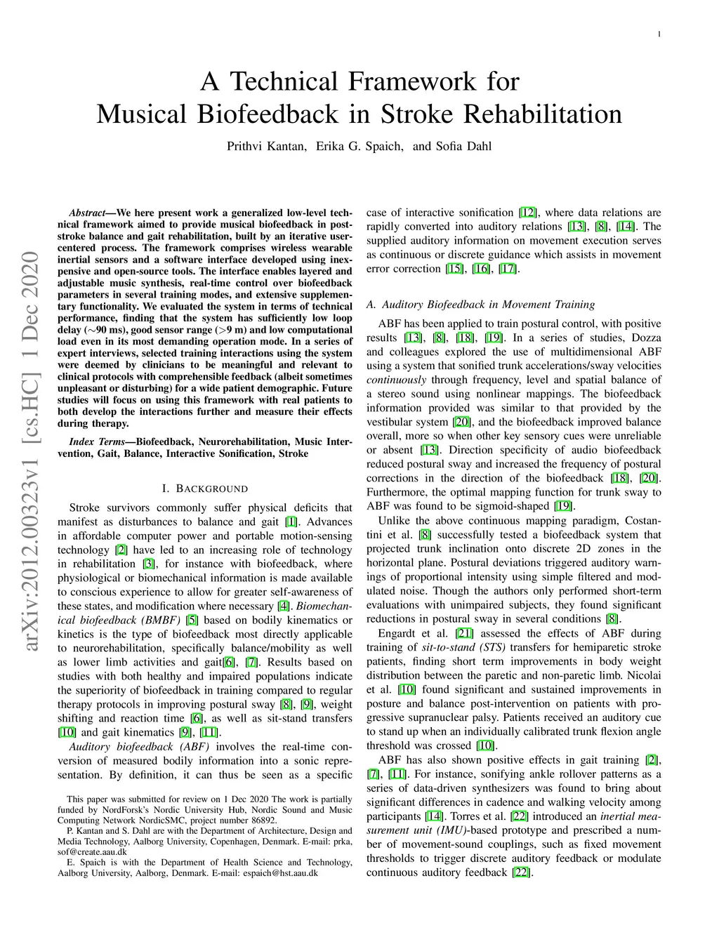 We here present work a generalized low-level technical framework aimed to provide musical biofeedback in post-stroke balance and gait rehabilitation, built by an iterative user-centered process. The framework comprises wireless wearable inertial sensors and a software interface developed using inexpensive and open-source tools. The interface enables layered and adjustable music synthesis, real-time control over biofeedback parameters in several training modes, and extensive supplementary functionality. We evaluated the system in terms of technical performance, finding that the system has sufficiently low loop delay (~90 ms), good sensor range (>9 m) and low computational load even in its most demanding operation mode. In a series of expert interviews, selected training interactions using the system were deemed by clinicians to be meaningful and relevant to clinical protocols with comprehensible feedback (albeit sometimes unpleasant or disturbing) for a wide patient demographic. Future studies will focus on using this framework with real patients to both develop the interactions further and measure their effects during therapy.