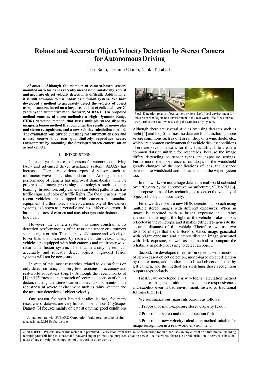 Although the number of camera-based sensors mounted on vehicles has recently increased dramatically, robust and accurate object velocity detection is difficult. Additionally, it is still common to use radar as a fusion system. We have developed a method to accurately detect the velocity of object using a camera, based on a large-scale dataset collected over 20 years by the automotive manufacturer, SUBARU. The proposed method consists of three methods: an High Dynamic Range (HDR) detection method that fuses multiple stereo disparity images, a fusion method that combines the results of monocular and stereo recognitions, and a new velocity calculation method. The evaluation was carried out using measurement devices and a test course that can quantitatively reproduce severe environment by mounting the developed stereo camera on an actual vehicle.