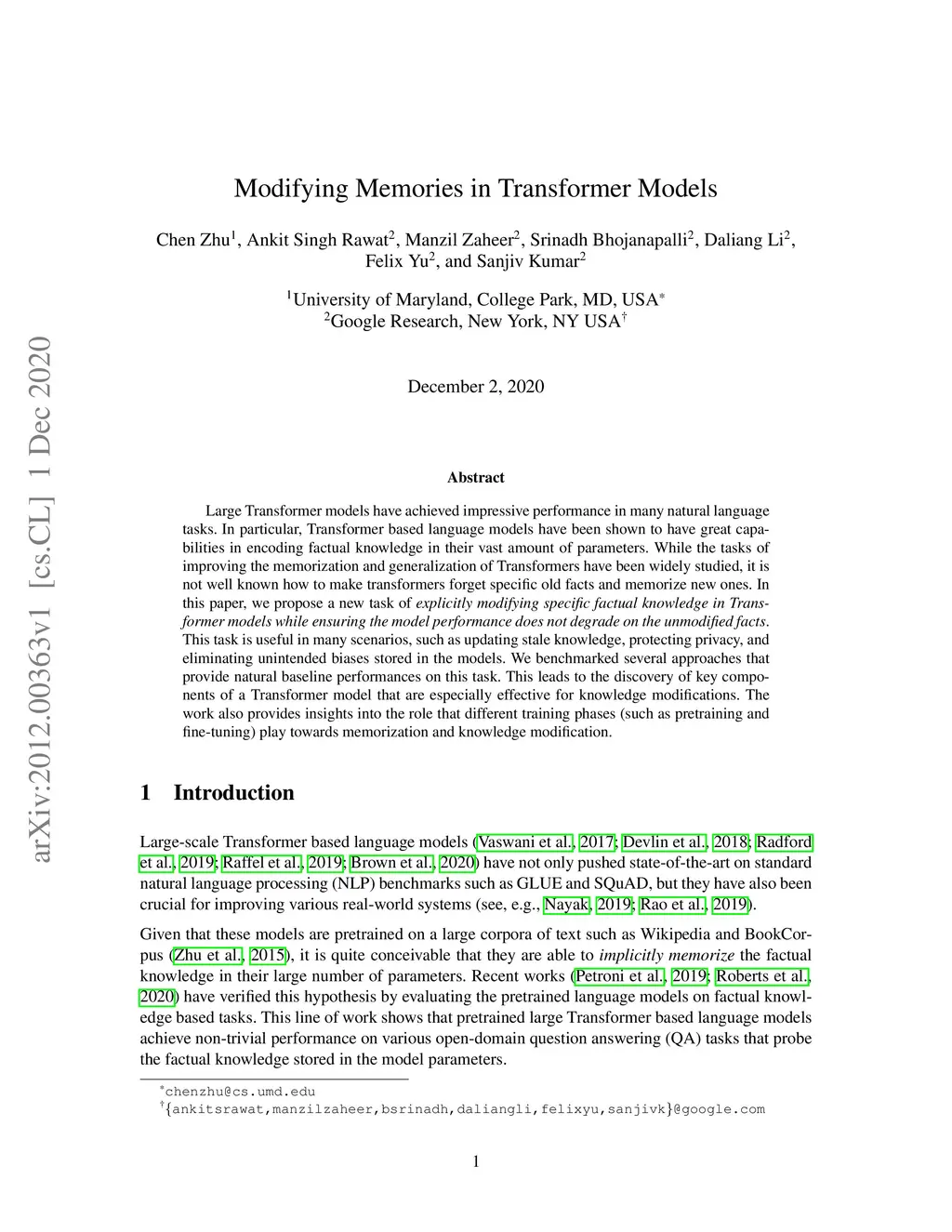 Large Transformer models have achieved impressive performance in many natural language tasks. In particular, Transformer based language models have been shown to have great capabilities in encoding factual knowledge in their vast amount of parameters. While the tasks of improving the memorization and generalization of Transformers have been widely studied, it is not well known how to make transformers forget specific old facts and memorize new ones. In this paper, we propose a new task of \emph{explicitly modifying specific factual knowledge in Transformer models while ensuring the model performance does not degrade on the unmodified facts}. This task is useful in many scenarios, such as updating stale knowledge, protecting privacy, and eliminating unintended biases stored in the models. We benchmarked several approaches that provide natural baseline performances on this task. This leads to the discovery of key components of a Transformer model that are especially effective for knowledge modifications. The work also provides insights into the role that different training phases (such as pretraining and fine-tuning) play towards memorization and knowledge modification.
