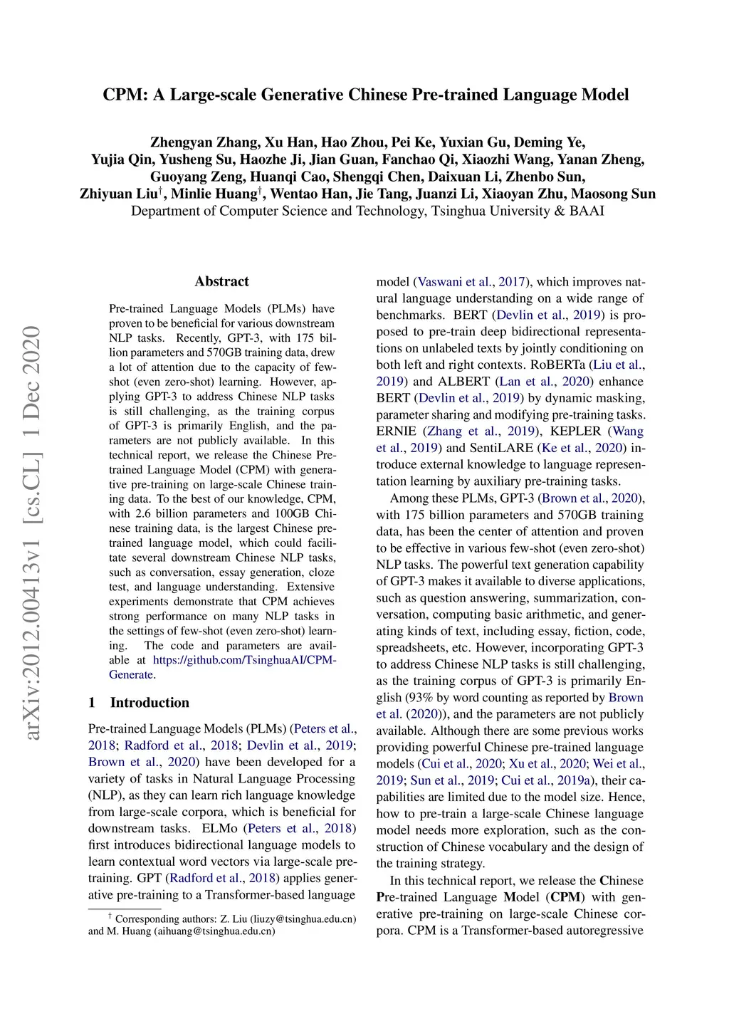 CPM: A Large-scale Generative Chinese Pre-trained Language Model