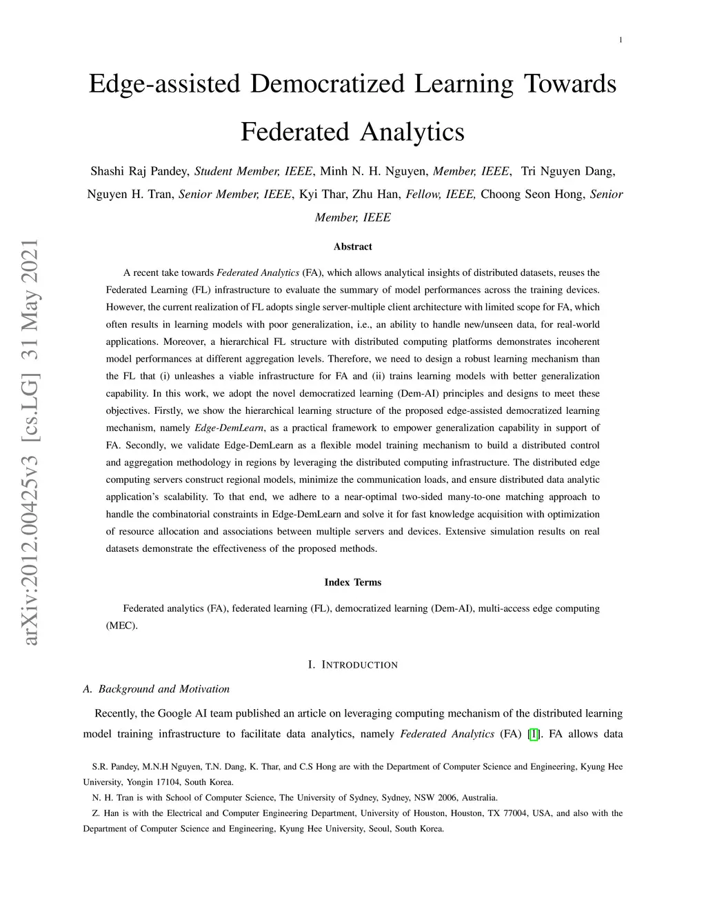 A recent take towards Federated Analytics (FA), which allows analytical insights of distributed datasets, reuses the Federated Learning (FL) infrastructure to evaluate the summary of model performances across the training devices. However, the current realization of FL adopts single server-multiple client architecture with limited scope for FA, which often results in learning models with poor generalization, i.e., an ability to handle new/unseen data, for real-world applications. Moreover, a hierarchical FL structure with distributed computing platforms demonstrates incoherent model performances at different aggregation levels. Therefore, we need to design a robust learning mechanism than the FL that (i) unleashes a viable infrastructure for FA and (ii) trains learning models with better generalization capability. In this work, we adopt the novel democratized learning (Dem-AI) principles and designs to meet these objectives. Firstly, we show the hierarchical learning structure of the proposed edge-assisted democratized learning mechanism, namely Edge-DemLearn, as a practical framework to empower generalization capability in support of FA. Secondly, we validate Edge-DemLearn as a flexible model training mechanism to build a distributed control and aggregation methodology in regions by leveraging the distributed computing infrastructure. The distributed edge computing servers construct regional models, minimize the communication loads, and ensure distributed data analytic application's scalability. To that end, we adhere to a near-optimal two-sided many-to-one matching approach to handle the combinatorial constraints in Edge-DemLearn and solve it for fast knowledge acquisition with optimization of resource allocation and associations between multiple servers and devices. Extensive simulation results on real datasets demonstrate the effectiveness of the proposed methods.