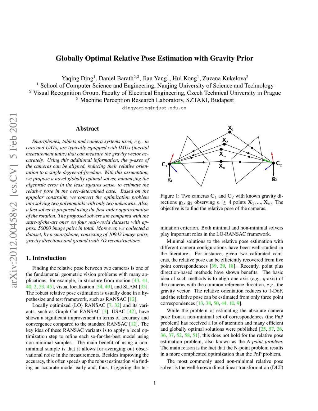 Smartphones, tablets and camera systems used, e.g., in cars and UAVs, are typically equipped with IMUs (inertial measurement units) that can measure the gravity vector accurately. Using this additional information, the -axes of the cameras can be aligned, reducing their relative orientation to a single degree-of-freedom. With this assumption, we propose a novel globally optimal solver, minimizing the algebraic error in the least-squares sense, to estimate the relative pose in the over-determined case. Based on the epipolar constraint, we convert the optimization problem into solving two polynomials with only two unknowns. Also, a fast solver is proposed using the first-order approximation of the rotation. The proposed solvers are compared with the state-of-the-art ones on four real-world datasets with approx. 50000 image pairs in total. Moreover, we collected a dataset, by a smartphone, consisting of 10933 image pairs, gravity directions, and ground truth 3D reconstructions.