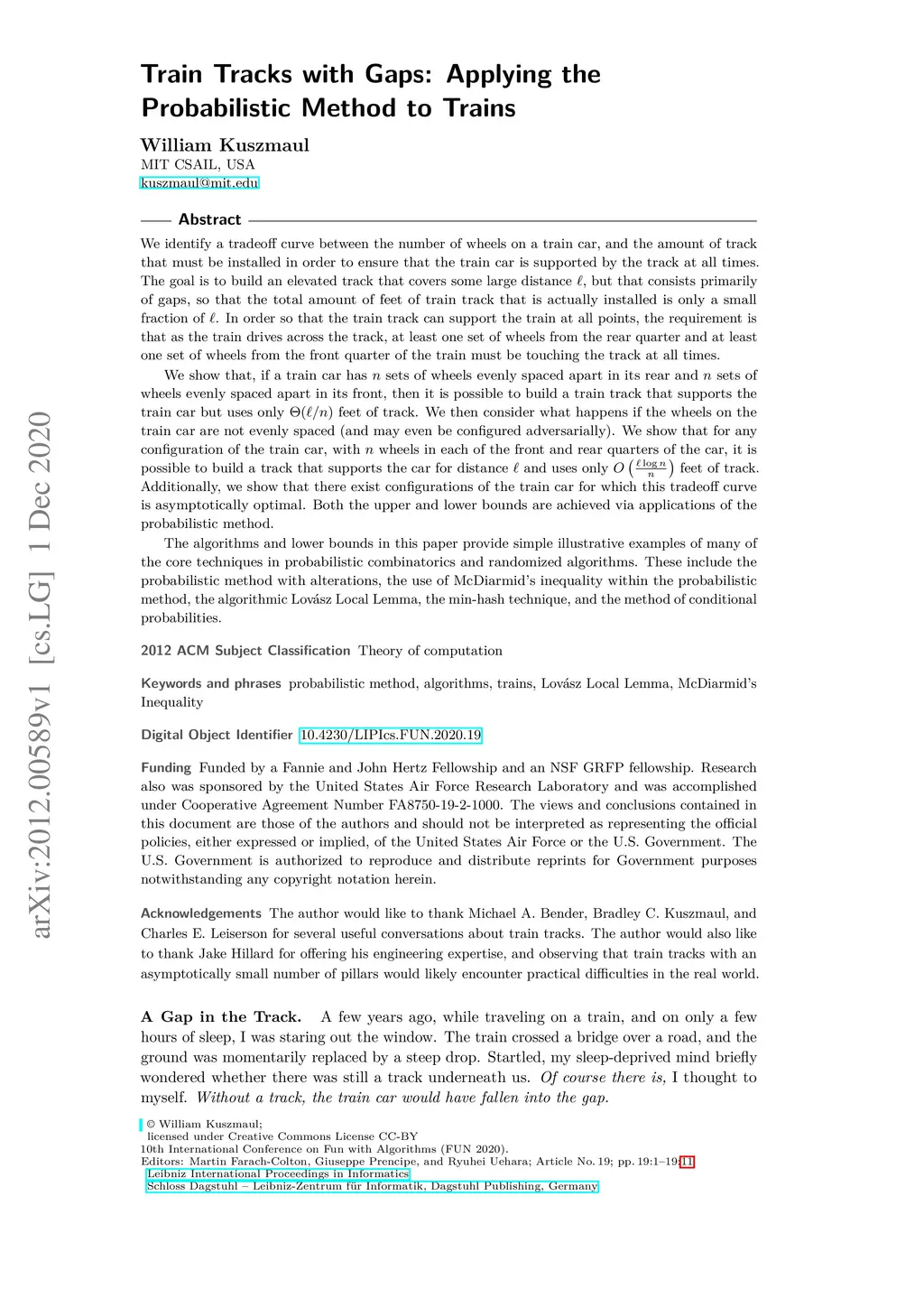 We identify a tradeoff curve between the number of wheels on a train car, and the amount of track that must be installed in order to ensure that the train car is supported by the track at all times. The goal is to build an elevated track that covers some large distance , but that consists primarily of gaps, so that the total amount of feet of train track that is actually installed is only a small fraction of . In order so that the train track can support the train at all points, the requirement is that as the train drives across the track, at least one set of wheels from the rear quarter and at least one set of wheels from the front quarter of the train must be touching the track at all times. We show that, if a train car has sets of wheels evenly spaced apart in its rear and sets of wheels evenly spaced apart in its front, then it is possible to build a train track that supports the train car but uses only feet of track. We then consider what happens if the wheels on the train car are not evenly spaced (and may even be configured adversarially). We show that for any configuration of the train car, with wheels in each of the front and rear quarters of the car, it is possible to build a track that supports the car for distance and uses only feet of track. Additionally, we show that there exist configurations of the train car for which this tradeoff curve is asymptotically optimal. Both the upper and lower bounds are achieved via applications of the probabilistic method.