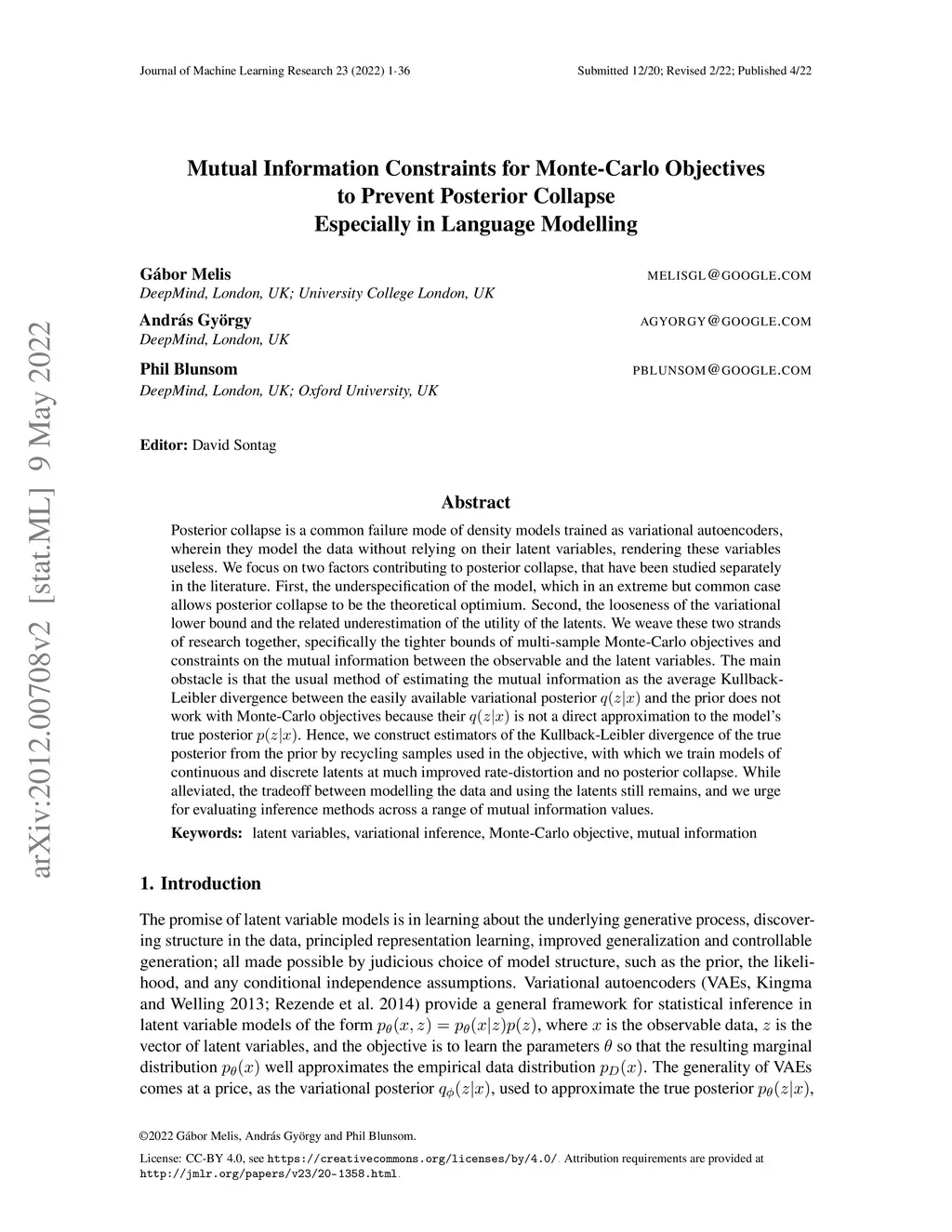 A common failure mode of density models trained as variational autoencoders is to model the data without relying on their latent variables, rendering these variables useless. Two contributing factors, the underspecification of the model and the looseness of the variational lower bound, have been studied separately in the literature. We weave these two strands of research together, specifically the tighter bounds of Monte-Carlo objectives and constraints on the mutual information between the observable and the latent variables. Estimating the mutual information as the average Kullback-Leibler divergence between the easily available variational posterior and the prior does not work with Monte-Carlo objectives because is no longer a direct approximation to the model's true posterior . Hence, we construct estimators of the Kullback-Leibler divergence of the true posterior from the prior by recycling samples used in the objective, with which we train models of continuous and discrete latents at much improved rate-distortion and no posterior collapse. While alleviated, the tradeoff between modelling the data and using the latents still remains, and we urge for evaluating inference methods across a range of mutual information values.
