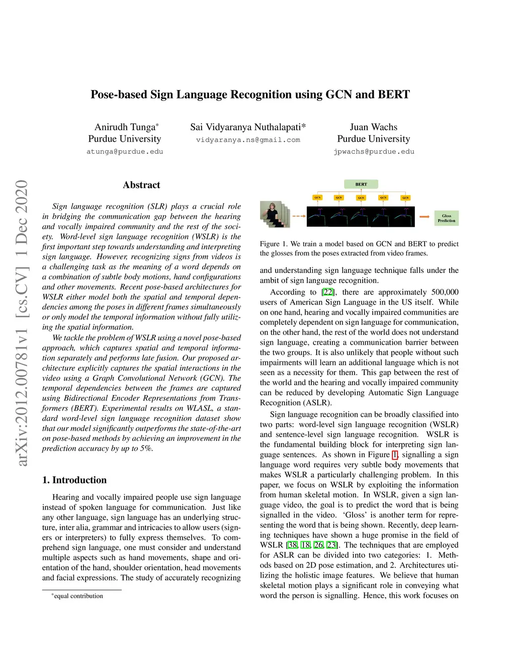 Sign language recognition (SLR) plays a crucial role in bridging the communication gap between the hearing and vocally impaired community and the rest of the society. Word-level sign language recognition (WSLR) is the first important step towards understanding and interpreting sign language. However, recognizing signs from videos is a challenging task as the meaning of a word depends on a combination of subtle body motions, hand configurations, and other movements. Recent pose-based architectures for WSLR either model both the spatial and temporal dependencies among the poses in different frames simultaneously or only model the temporal information without fully utilizing the spatial information. We tackle the problem of WSLR using a novel pose-based approach, which captures spatial and temporal information separately and performs late fusion. Our proposed architecture explicitly captures the spatial interactions in the video using a Graph Convolutional Network (GCN). The temporal dependencies between the frames are captured using Bidirectional Encoder Representations from Transformers (BERT). Experimental results on WLASL, a standard word-level sign language recognition dataset show that our model significantly outperforms the state-of-the-art on pose-based methods by achieving an improvement in the prediction accuracy by up to 5%.