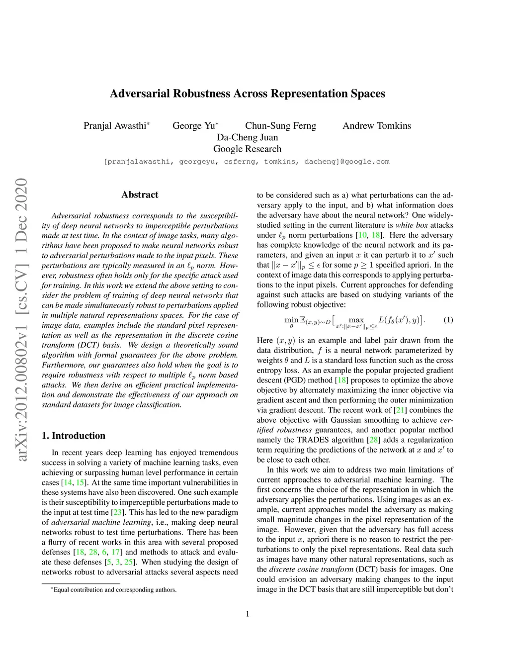 Adversarial robustness corresponds to the susceptibility of deep neural networks to imperceptible perturbations made at test time. In the context of image tasks, many algorithms have been proposed to make neural networks robust to adversarial perturbations made to the input pixels. These perturbations are typically measured in an norm. However, robustness often holds only for the specific attack used for training. In this work we extend the above setting to consider the problem of training of deep neural networks that can be made simultaneously robust to perturbations applied in multiple natural representation spaces. For the case of image data, examples include the standard pixel representation as well as the representation in the discrete cosine transform~(DCT) basis. We design a theoretically sound algorithm with formal guarantees for the above problem. Furthermore, our guarantees also hold when the goal is to require robustness with respect to multiple norm based attacks. We then derive an efficient practical implementation and demonstrate the effectiveness of our approach on standard datasets for image classification.