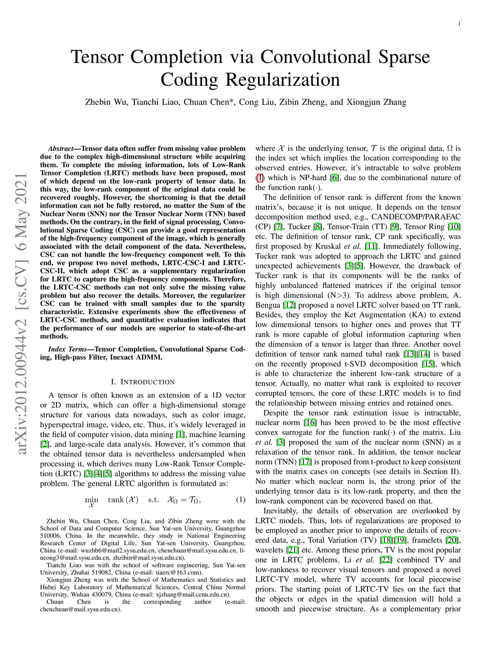 Tensor data often suffer from missing value problem due to the complex high-dimensional structure while acquiring them. To complete the missing information, lots of Low-Rank Tensor Completion (LRTC) methods have been proposed, most of which depend on the low-rank property of tensor data. In this way, the low-rank component of the original data could be recovered roughly. However, the shortcoming is that the detail information can not be fully restored, no matter the Sum of the Nuclear Norm (SNN) nor the Tensor Nuclear Norm (TNN) based methods. On the contrary, in the field of signal processing, Convolutional Sparse Coding (CSC) can provide a good representation of the high-frequency component of the image, which is generally associated with the detail component of the data. Nevertheless, CSC can not handle the low-frequency component well. To this end, we propose two novel methods, LRTC-CSC-I and LRTC-CSC-II, which adopt CSC as a supplementary regularization for LRTC to capture the high-frequency components. Therefore, the LRTC-CSC methods can not only solve the missing value problem but also recover the details. Moreover, the regularizer CSC can be trained with small samples due to the sparsity characteristic. Extensive experiments show the effectiveness of LRTC-CSC methods, and quantitative evaluation indicates that the performance of our models are superior to state-of-the-art methods.