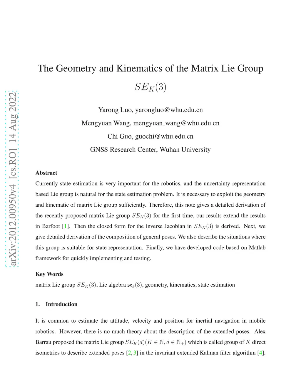 Currently state estimation is very important for the robotics, and the uncertainty representation based Lie group is natural for the state estimation problem. It is necessary to exploit the geometry and kinematic of matrix Lie group sufficiently. Therefore, this note gives a detailed derivation of the recently proposed matrix Lie group for the first time, our results extend the results in Barfoot \cite{barfoot2017state}. Then we describe the situations where this group is suitable for state representation. We also have developed code based on Matlab framework for quickly implementing and testing.