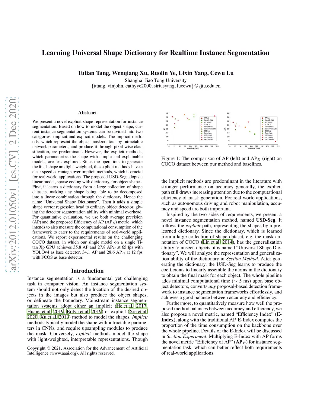 We present a novel explicit shape representation for instance segmentation. Based on how to model the object shape, current instance segmentation systems can be divided into two categories, implicit and explicit models. The implicit methods, which represent the object mask/contour by intractable network parameters, and produce it through pixel-wise classification, are predominant. However, the explicit methods, which parameterize the shape with simple and explainable models, are less explored. Since the operations to generate the final shape are light-weighted, the explicit methods have a clear speed advantage over implicit methods, which is crucial for real-world applications. The proposed USD-Seg adopts a linear model, sparse coding with dictionary, for object shapes. First, it learns a dictionary from a large collection of shape datasets, making any shape being able to be decomposed into a linear combination through the dictionary. Hence the name "Universal Shape Dictionary". Then it adds a simple shape vector regression head to ordinary object detector, giving the detector segmentation ability with minimal overhead. For quantitative evaluation, we use both average precision (AP) and the proposed Efficiency of AP (AP) metric, which intends to also measure the computational consumption of the framework to cater to the requirements of real-world applications. We report experimental results on the challenging COCO dataset, in which our single model on a single Titan Xp GPU achieves 35.8 AP and 27.8 AP at 65 fps with YOLOv4 as base detector, 34.1 AP and 28.6 AP at 12 fps with FCOS as base detector.