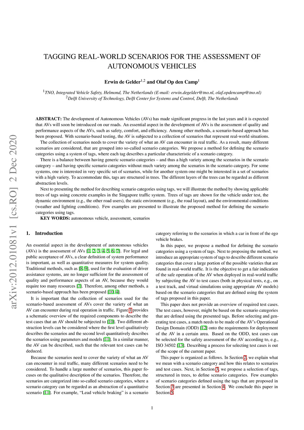 The development of Autonomous Vehicles (AVs) has made significant progress in the last years. An essential aspect in the development of AVs is the assessment of quality and performance aspects of the AVs, such as safety, comfort, and efficiency. Among other methods, a scenario-based approach has been proposed. With scenario-based testing, the AV is subjected to a collection of scenarios that represent real-world situations. The collection of scenarios needs to cover the variety of what an AV can encounter in real traffic. As a result, many different scenarios are considered, that are grouped into so-called scenario categories. We propose a method for defining the scenario categories using a system of tags, where each tag describes a particular characteristic of a scenario category. There is a balance between having generic scenario categories - very specific set of scenarios, while for another system one might be interested in a set of scenarios with a high variety. To accommodate this, tags are structured in trees. The different layers of the trees can be regarded as different abstraction levels. Next to presenting the method for describing scenario categories using tags, we will illustrate the method by showing applicable trees of tags using concrete examples in the Singapore traffic system. Trees of tags are shown for the vehicle under test, the dynamic environment (e.g., the other road users), the static environment (e.g., the road layout), and the environmental conditions (weather and lighting conditions). Few examples are presented to illustrate the proposed method for defining the scenario categories using tags.