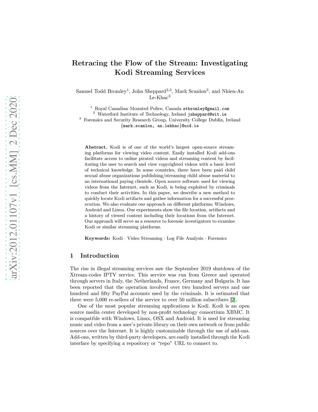 Kodi is of one of the world's largest open-source streaming platforms for viewing video content. Easily installed Kodi add-ons facilitate access to online pirated videos and streaming content by facilitating the user to search and view copyrighted videos with a basic level of technical knowledge. In some countries, there have been paid child sexual abuse organizations publishing/streaming child abuse material to an international paying clientele. Open source software used for viewing videos from the Internet, such as Kodi, is being exploited by criminals to conduct their activities. In this paper, we describe a new method to quickly locate Kodi artifacts and gather information for a successful prosecution. We also evaluate our approach on different platforms; Windows, Android and Linux. Our experiments show the file location, artifacts and a history of viewed content including their locations from the Internet. Our approach will serve as a resource to forensic investigators to examine Kodi or similar streaming platforms.