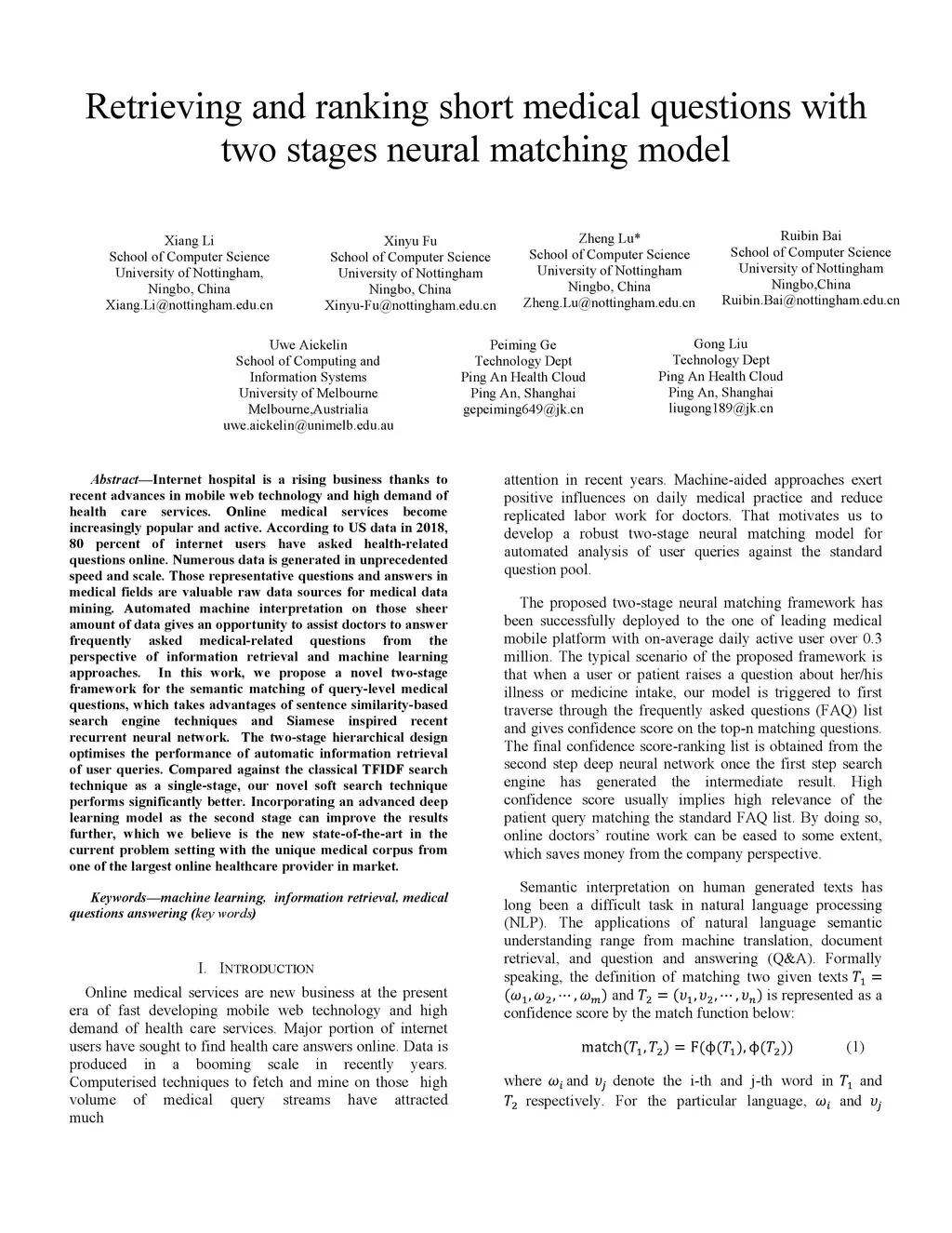 Internet hospital is a rising business thanks to recent advances in mobile web technology and high demand of health care services. Online medical services become increasingly popular and active. According to US data in 2018, 80 percent of internet users have asked health-related questions online. Numerous data is generated in unprecedented speed and scale. Those representative questions and answers in medical fields are valuable raw data sources for medical data mining. Automated machine interpretation on those sheer amount of data gives an opportunity to assist doctors to answer frequently asked medical-related questions from the perspective of information retrieval and machine learning approaches. In this work, we propose a novel two-stage framework for the semantic matching of query-level medical questions.
