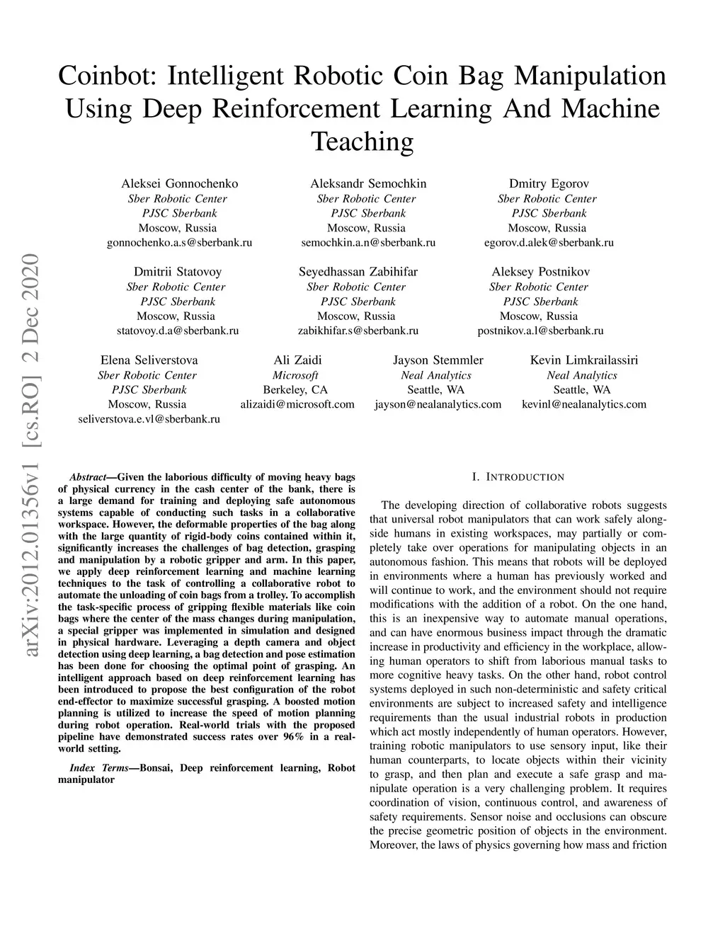 Coinbot: Intelligent Robotic Coin Bag Manipulation Using Deep