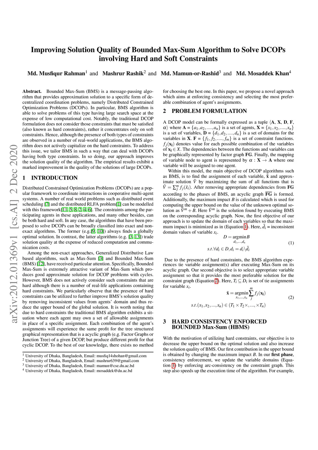 Bounded Max-Sum (BMS) is a message-passing algorithm that provides approximation solution to a specific form of de-centralized coordination problems, namely Distributed Constrained Optimization Problems (DCOPs). In particular, BMS algorithm is able to solve problems of this type having large search space at the expense of low computational cost. Notably, the traditional DCOP formulation does not consider those constraints that must be satisfied(also known as hard constraints), rather it concentrates only on soft constraints. Hence, although the presence of both types of constraints are observed in a number of real-world applications, the BMS algorithm does not actively capitalize on the hard constraints. To address this issue, we tailor BMS in such a way that can deal with DCOPs having both type constraints. In so doing, our approach improves the solution quality of the algorithm. The empirical results exhibit a marked improvement in the quality of the solutions of large DCOPs.