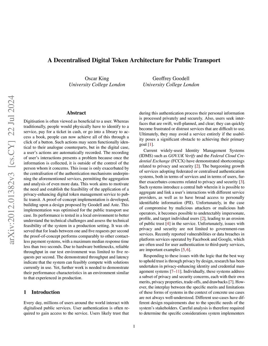 Digitisation is often viewed as beneficial to a user. Where originally people would physically have to identify to a service, pay for a ticket in cash, or go into a library to access a book, people can now achieve all of this through a click of a button. While these actions may seem functionally identical to their analogue counterparts, they come with one important difference. Namely, in the digital case, a user's actions are automatically recorded. The recording of user's interactions presents a problem because this information can be used outside the control of the person whom it concerns. This issue is only exacerbated by the centralisation of these aforementioned services' authentication mechanisms permitting the collection of even more data. This work aims to motivate the need and establish the feasibility for the application of a privacy-enhancing digital token management service to public transit. A proof-of-concept implementation of the Decentralised Digital Identity Architecture proposed by Goodell and Aste is developed. This implementation was optimised for the public transport use case. Finally, its performance is tested in a local environment to better understand the technical challenges and assess such a system's technical feasibility in a production setting. It was observed that for loads between 1 and 5 requests per second the proof-of-concept performs within acceptable limits with a maximum median response time of 438 milliseconds. Above 5 requests per second response times drastically increase due to hardware bottlenecks. It was concluded that the demonstrated throughput and latency shows that the system can feasibly compete with solutions currently in use. Yet, further work is needed to demonstrate these performance characteristics in an environment similar to that experienced in production.