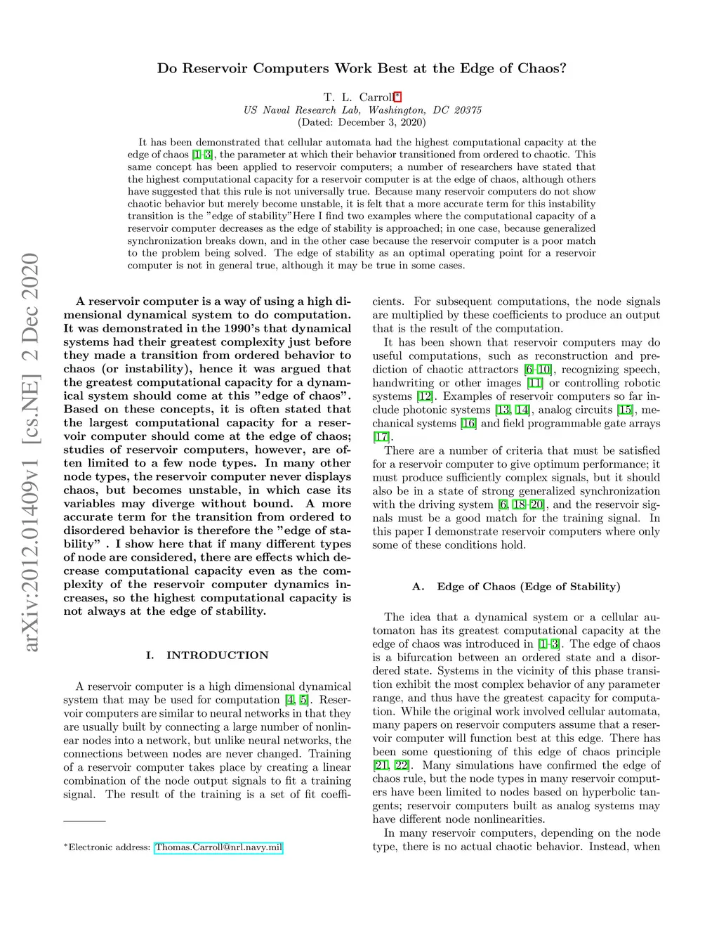 It has been demonstrated that cellular automata had the highest computational capacity at the edge of chaos, the parameter at which their behavior transitioned from ordered to chaotic. This same concept has been applied to reservoir computers; a number of researchers have stated that the highest computational capacity for a reservoir computer is at the edge of chaos, although others have suggested that this rule is not universally true. Because many reservoir computers do not show chaotic behavior but merely become unstable, it is felt that a more accurate term for this instability transition is the "edge of stability"Here I find two examples where the computational capacity of a reservoir computer decreases as the edge of stability is approached; in one case, because generalized synchronization breaks down, and in the other case because the reservoir computer is a poor match to the problem being solved. The edge of stability as an optimal operating point for a reservoir computer is not in general true, although it may be true in some cases.