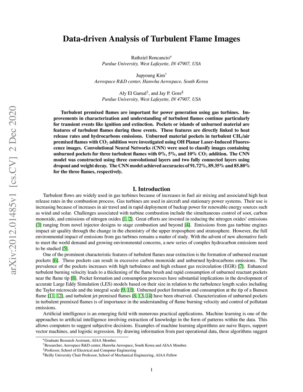 Turbulent premixed flames are important for power generation using gas turbines. Improvements in characterization and understanding of turbulent flames continue particularly for transient events like ignition and extinction. Pockets or islands of unburned material are features of turbulent flames during these events. These features are directly linked to heat release rates and hydrocarbons emissions. Unburned material pockets in turbulent CH/air premixed flames with CO addition were investigated using OH Planar Laser-Induced Fluorescence images. Convolutional Neural Networks (CNN) were used to classify images containing unburned pockets for three turbulent flames with 0%, 5%, and 10% CO addition. The CNN model was constructed using three convolutional layers and two fully connected layers using dropout and weight decay. The CNN model achieved accuracies of 91.72%, 89.35% and 85.80% for the three flames, respectively.