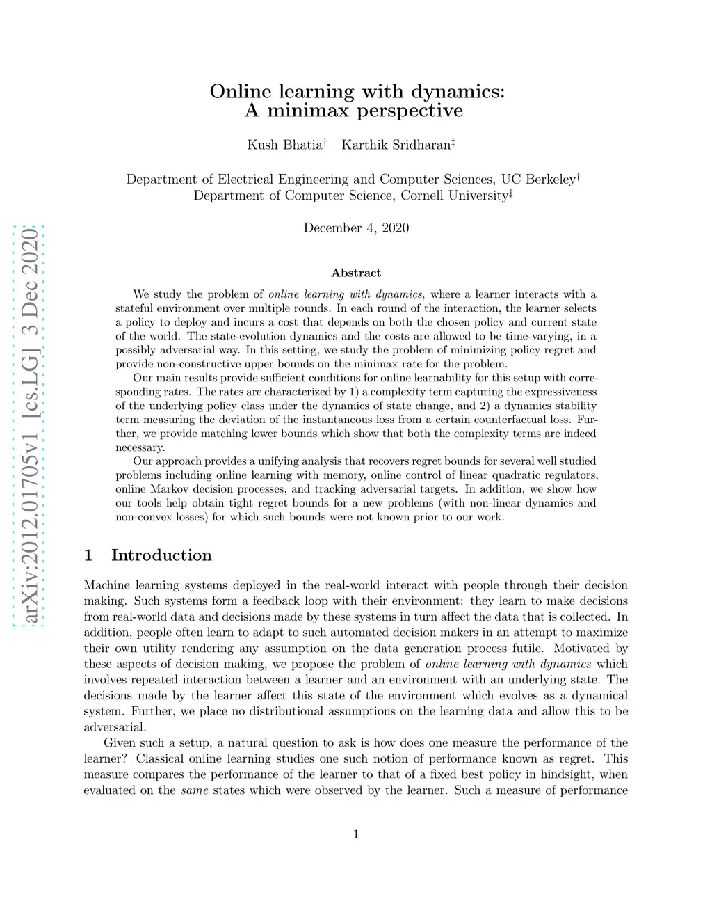 We study the problem of online learning with dynamics, where a learner interacts with a stateful environment over multiple rounds. In each round of the interaction, the learner selects a policy to deploy and incurs a cost that depends on both the chosen policy and current state of the world. The state-evolution dynamics and the costs are allowed to be time-varying, in a possibly adversarial way. In this setting, we study the problem of minimizing policy regret and provide non-constructive upper bounds on the minimax rate for the problem. Our main results provide sufficient conditions for online learnability for this setup with corresponding rates. The rates are characterized by 1) a complexity term capturing the expressiveness of the underlying policy class under the dynamics of state change, and 2) a dynamics stability term measuring the deviation of the instantaneous loss from a certain counterfactual loss. Further, we provide matching lower bounds which show that both the complexity terms are indeed necessary. Our approach provides a unifying analysis that recovers regret bounds for several well studied problems including online learning with memory, online control of linear quadratic regulators, online Markov decision processes, and tracking adversarial targets. In addition, we show how our tools help obtain tight regret bounds for a new problems (with non-linear dynamics and non-convex losses) for which such bounds were not known prior to our work.