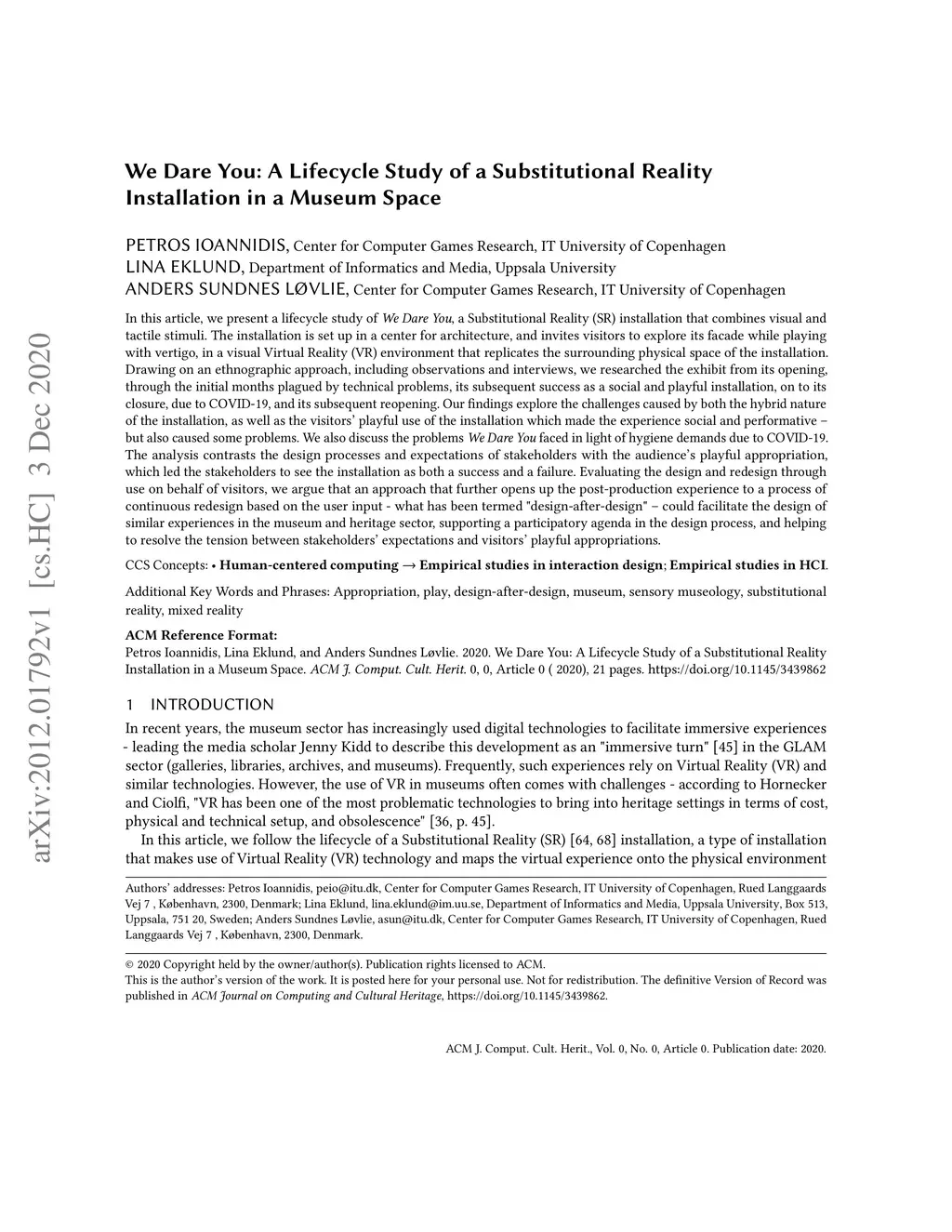In this article, we present a lifecycle study of We Dare You, a Substitutional Reality (SR) installation that combines visual and tactile stimuli. The installation is set up in a center for architecture, and invites visitors to explore its facade while playing with vertigo, in a visual Virtual Reality (VR) environment that replicates the surrounding physical space of the installation. Drawing on an ethnographic approach, including observations and interviews, we researched the exhibit from its opening, through the initial months plagued by technical problems, its subsequent success as a social and playful installation, on to its closure, due to COVID-19, and its subsequent reopening. Our findings explore the challenges caused by both the hybrid nature of the installation, as well as the visitor' playful use of the installation which made the experience social and performative - but also caused some problems. We also discuss the problems We Dare You faced in light of hygiene demands due to COVID-19. The analysis contrasts the design processes and expectations of stakeholders with the audience's playful appropriation, which led the stakeholders to see the installation as both a success and a failure. Evaluating the design and redesign through use on behalf of visitors, we argue that an approach that further opens up the post-production experience to a process of continuous redesign based on the user input - what has been termed "design-after-design" - could facilitate the design of similar experiences in the museum and heritage sector, supporting a participatory agenda in the design process, and helping to resolve the tension between stakeholders' expectations and visitors' playful appropriations.