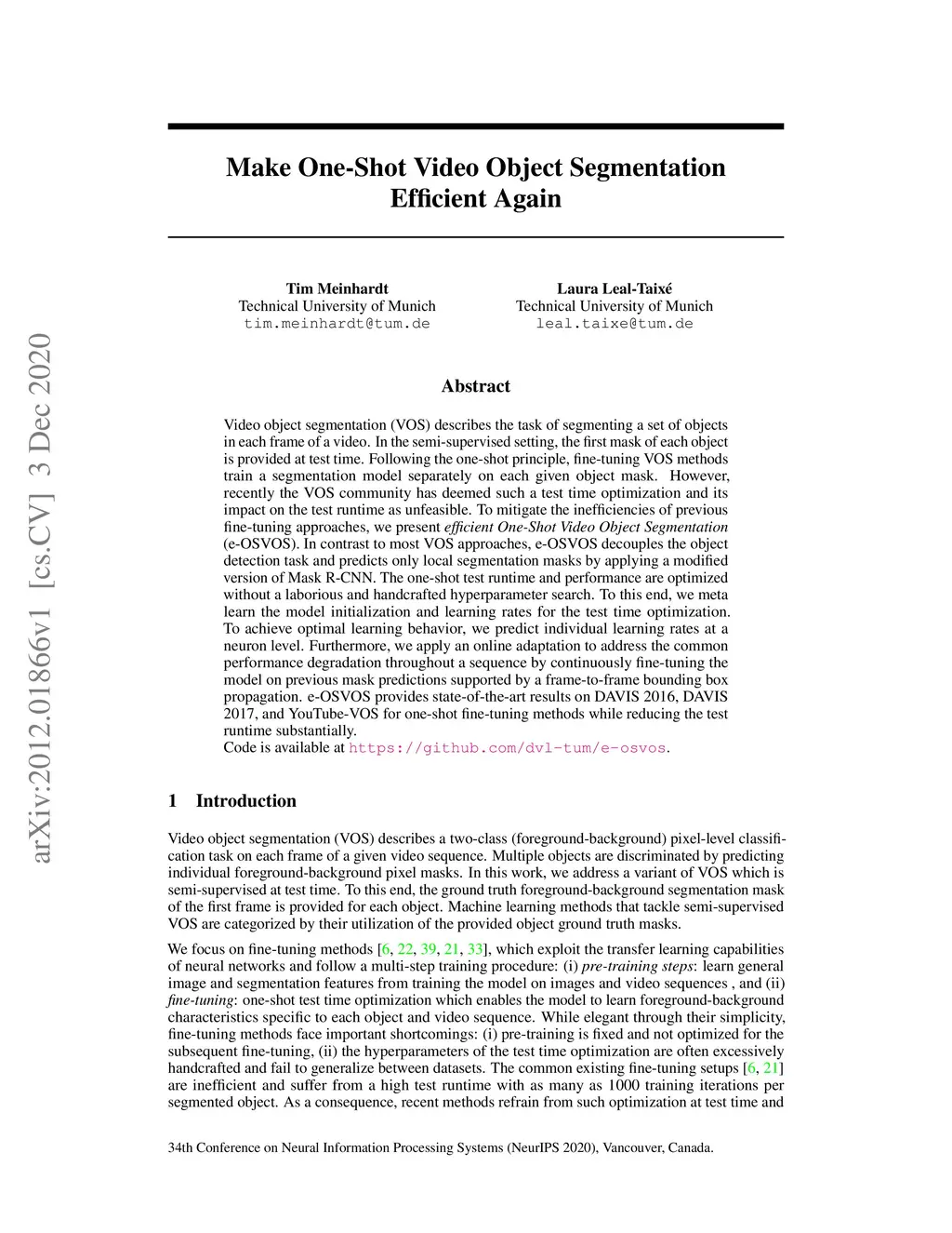 Video object segmentation (VOS) describes the task of segmenting a set of objects in each frame of a video. In the semi-supervised setting, the first mask of each object is provided at test time. Following the one-shot principle, fine-tuning VOS methods train a segmentation model separately on each given object mask. However, recently the VOS community has deemed such a test time optimization and its impact on the test runtime as unfeasible. To mitigate the inefficiencies of previous fine-tuning approaches, we present efficient One-Shot Video Object Segmentation (e-OSVOS). In contrast to most VOS approaches, e-OSVOS decouples the object detection task and predicts only local segmentation masks by applying a modified version of Mask R-CNN. The one-shot test runtime and performance are optimized without a laborious and handcrafted hyperparameter search. To this end, we meta learn the model initialization and learning rates for the test time optimization. To achieve optimal learning behavior, we predict individual learning rates at a neuron level. Furthermore, we apply an online adaptation to address the common performance degradation throughout a sequence by continuously fine-tuning the model on previous mask predictions supported by a frame-to-frame bounding box propagation. e-OSVOS provides state-of-the-art results on DAVIS 2016, DAVIS 2017, and YouTube-VOS for one-shot fine-tuning methods while reducing the test runtime substantially. Code is available at https://github.com/dvl-tum/e-osvos.