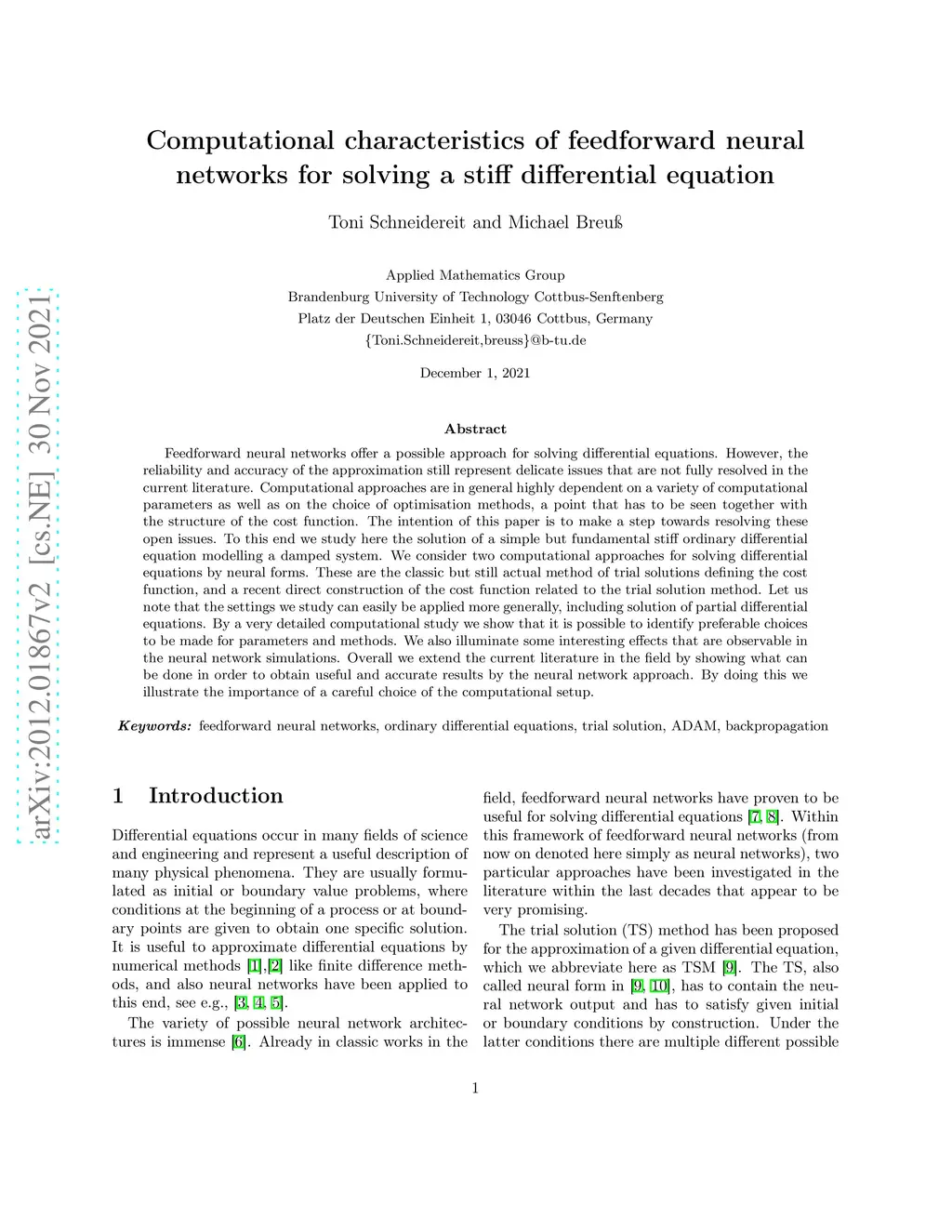 Feedforward neural networks offer a promising approach for solving differential equations. However, the reliability and accuracy of the approximation still represent delicate issues that are not fully resolved in the current literature. Computational approaches are in general highly dependent on a variety of computational parameters as well as on the choice of optimisation methods, a point that has to be seen together with the structure of the cost function. The intention of this paper is to make a step towards resolving these open issues. To this end we study here the solution of a simple but fundamental stiff ordinary differential equation modelling a damped system. We consider two computational approaches for solving differential equations by neural forms. These are the classic but still actual method of trial solutions defining the cost function, and a recent direct construction of the cost function related to the trial solution method. Let us note that the settings we study can easily be applied more generally, including solution of partial differential equations. By a very detailed computational study we show that it is possible to identify preferable choices to be made for parameters and methods. We also illuminate some interesting effects that are observable in the neural network simulations. Overall we extend the current literature in the field by showing what can be done in order to obtain reliable and accurate results by the neural network approach. By doing this we illustrate the importance of a careful choice of the computational setup.