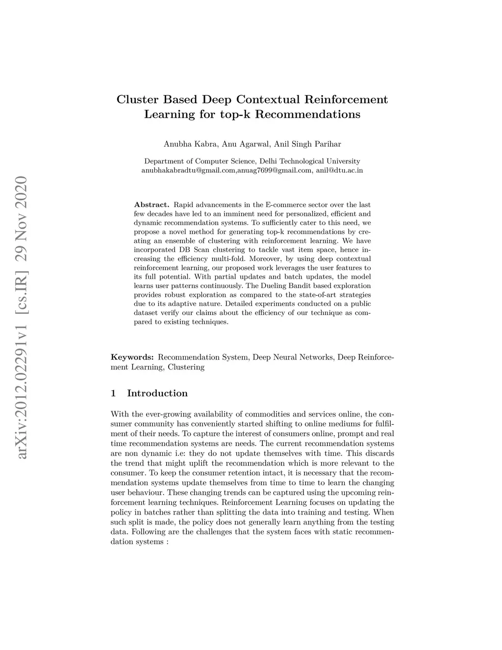 Rapid advancements in the E-commerce sector over the last few decades have led to an imminent need for personalised, efficient and dynamic recommendation systems. To sufficiently cater to this need, we propose a novel method for generating top-k recommendations by creating an ensemble of clustering with reinforcement learning. We have incorporated DB Scan clustering to tackle vast item space, hence in-creasing the efficiency multi-fold. Moreover, by using deep contextual reinforcement learning, our proposed work leverages the user features to its full potential. With partial updates and batch updates, the model learns user patterns continuously. The Duelling Bandit based exploration provides robust exploration as compared to the state-of-art strategies due to its adaptive nature. Detailed experiments conducted on a public dataset verify our claims about the efficiency of our technique as com-pared to existing techniques.