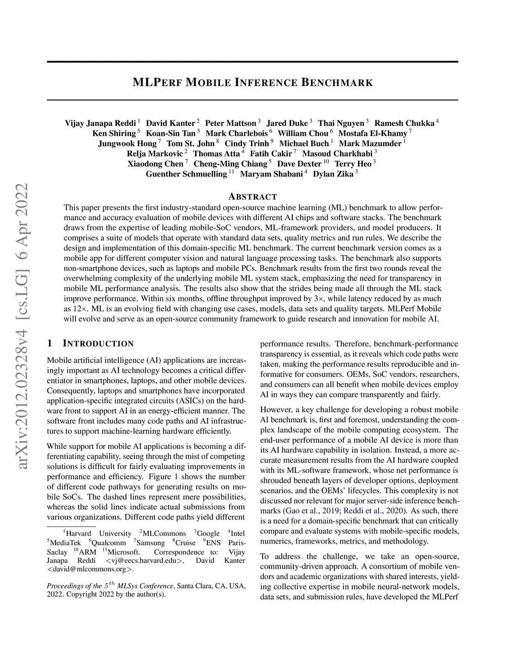 MLPerf Mobile is the first industry-standard open-source mobile benchmark developed by industry members and academic researchers to allow performance/accuracy evaluation of mobile devices with different AI chips and software stacks. The benchmark draws from the expertise of leading mobile-SoC vendors, ML-framework providers, and model producers. In this paper, we motivate the drive to demystify mobile-AI performance and present MLPerf Mobile's design considerations, architecture, and implementation. The benchmark comprises a suite of models that operate under standard models, data sets, quality metrics, and run rules. For the first iteration, we developed an app to provide an "out-of-the-box" inference-performance benchmark for computer vision and natural-language processing on mobile devices. MLPerf Mobile can serve as a framework for integrating future models, for customizing quality-target thresholds to evaluate system performance, for comparing software frameworks, and for assessing heterogeneous-hardware capabilities for machine learning, all fairly and faithfully with fully reproducible results.