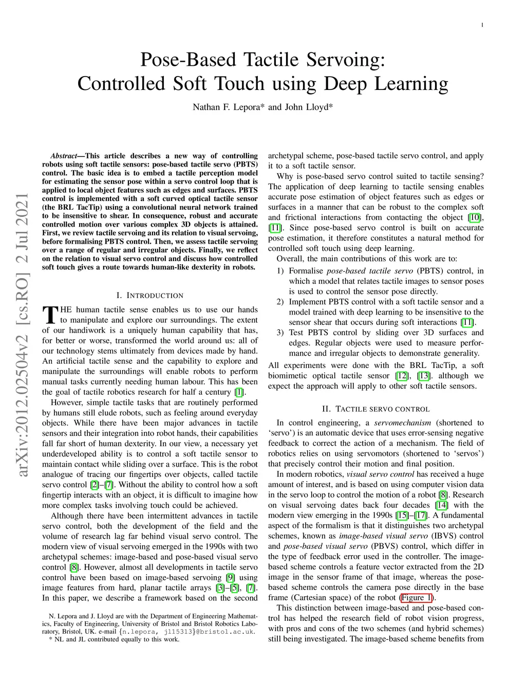 This article describes a new way of controlling robots using soft tactile sensors: pose-based tactile servo (PBTS) control. The basic idea is to embed a tactile perception model for estimating the sensor pose within a servo control loop that is applied to local object features such as edges and surfaces. PBTS control is implemented with a soft curved optical tactile sensor (the BRL TacTip) using a convolutional neural network trained to be insensitive to shear. In consequence, robust and accurate controlled motion over various complex 3D objects is attained. First, we review tactile servoing and its relation to visual servoing, before formalising PBTS control. Then, we assess tactile servoing over a range of regular and irregular objects. Finally, we reflect on the relation to visual servo control and discuss how controlled soft touch gives a route towards human-like dexterity in robots.