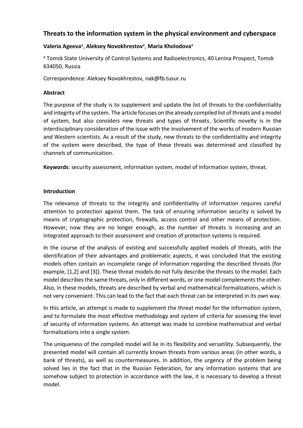 The purpose of the study is to supplement and update the list of threats to the confidentiality and integrity of the system. The article focuses on the already compiled list of threats and a model of system, but also considers new threats and types of threats. Scientific novelty is in the interdisciplinary consideration of the issue with the involvement of the works of modern Russian and Western scientists. As a result of the study, new threats to the confidentiality and integrity of the system were described, the type of these threats was determined and classified by channels of communication.