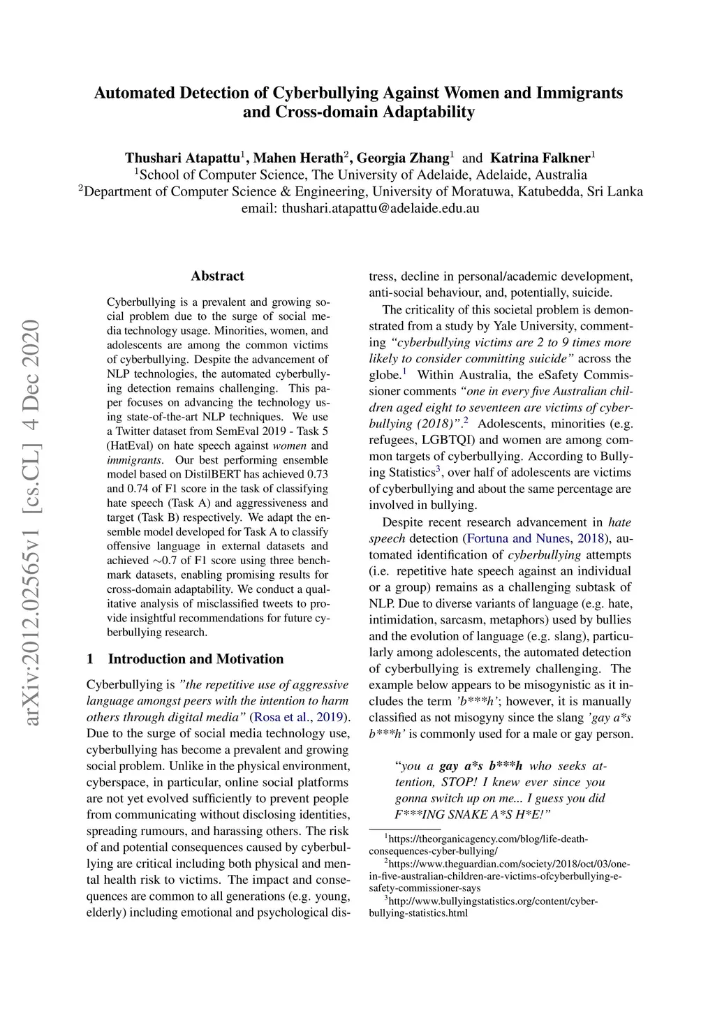Cyberbullying is a prevalent and growing social problem due to the surge of social media technology usage. Minorities, women, and adolescents are among the common victims of cyberbullying. Despite the advancement of NLP technologies, the automated cyberbullying detection remains challenging. This paper focuses on advancing the technology using state-of-the-art NLP techniques. We use a Twitter dataset from SemEval 2019 - Task 5(HatEval) on hate speech against women and immigrants. Our best performing ensemble model based on DistilBERT has achieved 0.73 and 0.74 of F1 score in the task of classifying hate speech (Task A) and aggressiveness and target (Task B) respectively. We adapt the ensemble model developed for Task A to classify offensive language in external datasets and achieved ~0.7 of F1 score using three benchmark datasets, enabling promising results for cross-domain adaptability. We conduct a qualitative analysis of misclassified tweets to provide insightful recommendations for future cyberbullying research.