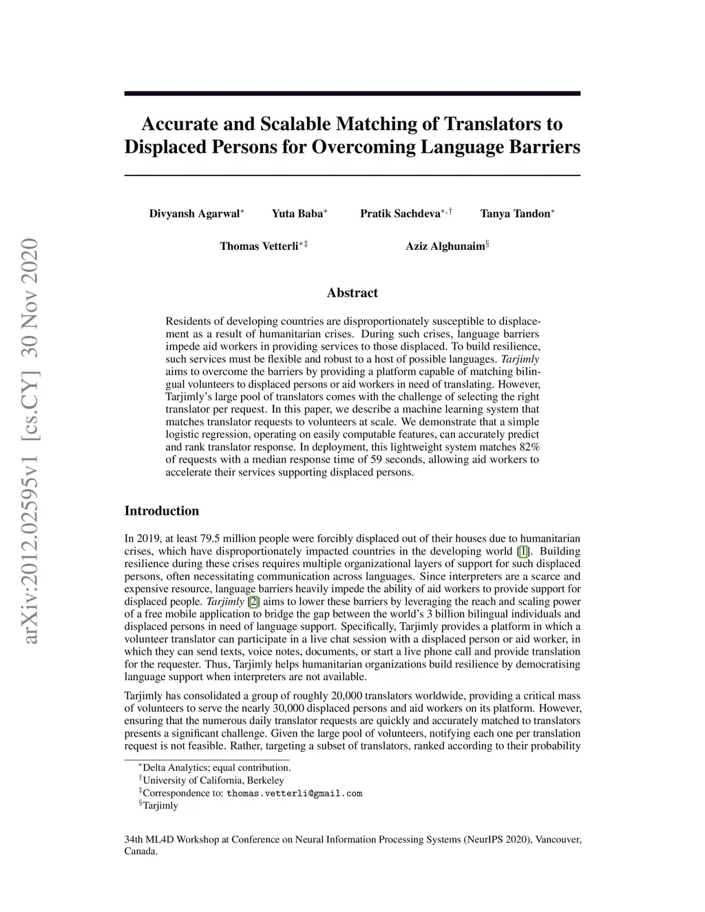 Residents of developing countries are disproportionately susceptible to displacement as a result of humanitarian crises. During such crises, language barriers impede aid workers in providing services to those displaced. To build resilience, such services must be flexible and robust to a host of possible languages. \textit{Tarjimly} aims to overcome the barriers by providing a platform capable of matching bilingual volunteers to displaced persons or aid workers in need of translating. However, Tarjimly's large pool of translators comes with the challenge of selecting the right translator per request. In this paper, we describe a machine learning system that matches translator requests to volunteers at scale. We demonstrate that a simple logistic regression, operating on easily computable features, can accurately predict and rank translator response. In deployment, this lightweight system matches 82\% of requests with a median response time of 59 seconds, allowing aid workers to accelerate their services supporting displaced persons.