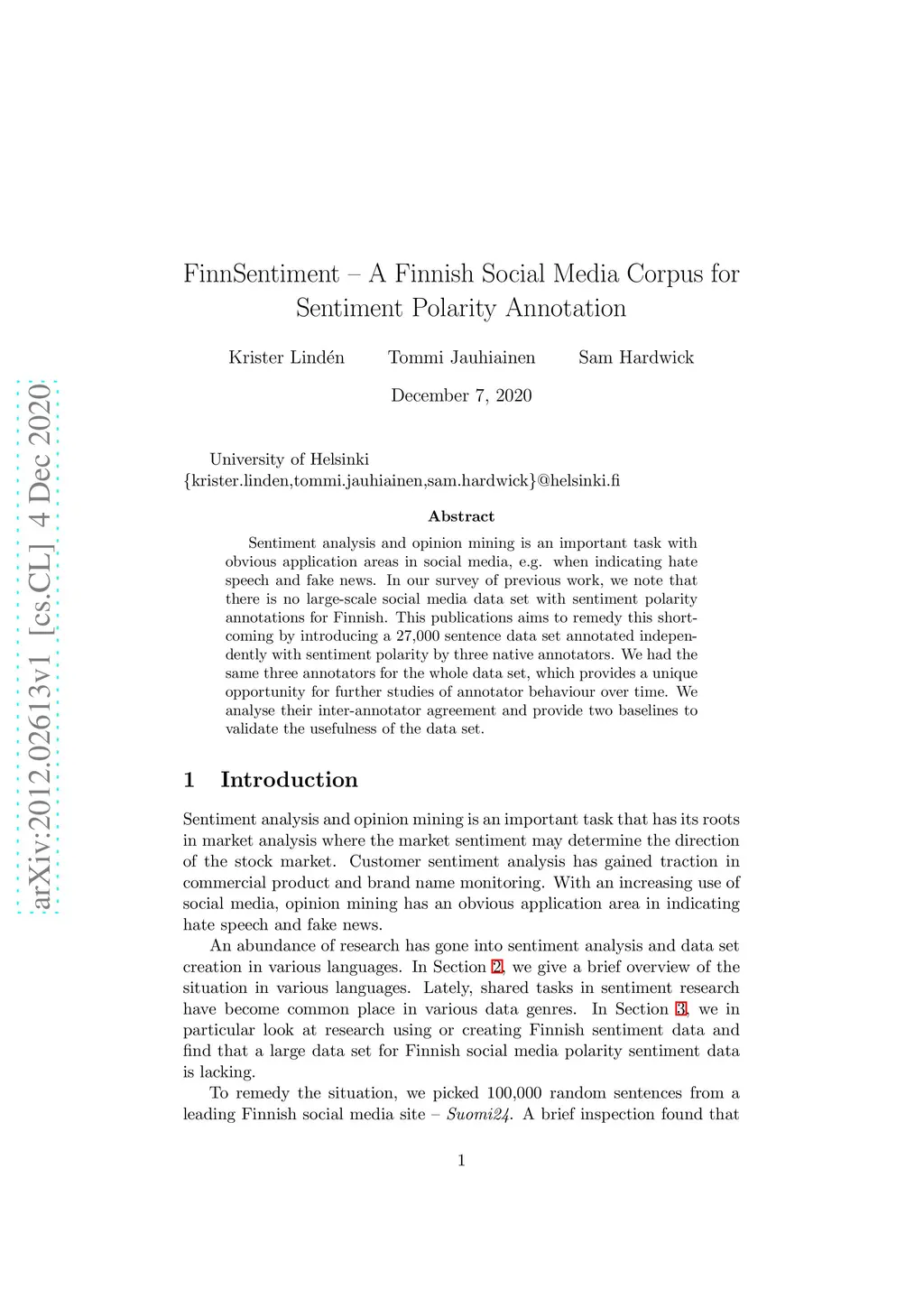 Sentiment analysis and opinion mining is an important task with obvious application areas in social media, e.g. when indicating hate speech and fake news. In our survey of previous work, we note that there is no large-scale social media data set with sentiment polarity annotations for Finnish. This publications aims to remedy this shortcoming by introducing a 27,000 sentence data set annotated independently with sentiment polarity by three native annotators. We had the same three annotators for the whole data set, which provides a unique opportunity for further studies of annotator behaviour over time. We analyse their inter-annotator agreement and provide two baselines to validate the usefulness of the data set.