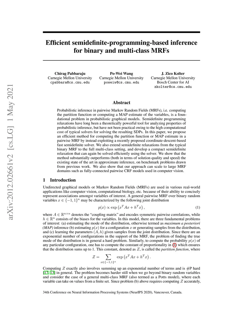 Probabilistic inference in pairwise Markov Random Fields (MRFs), i.e. computing the partition function or computing a MAP estimate of the variables, is a foundational problem in probabilistic graphical models. Semidefinite programming relaxations have long been a theoretically powerful tool for analyzing properties of probabilistic inference, but have not been practical owing to the high computational cost of typical solvers for solving the resulting SDPs. In this paper, we propose an efficient method for computing the partition function or MAP estimate in a pairwise MRF by instead exploiting a recently proposed coordinate-descent-based fast semidefinite solver. We also extend semidefinite relaxations from the typical binary MRF to the full multi-class setting, and develop a compact semidefinite relaxation that can again be solved efficiently using the solver. We show that the method substantially outperforms (both in terms of solution quality and speed) the existing state of the art in approximate inference, on benchmark problems drawn from previous work. We also show that our approach can scale to large MRF domains such as fully-connected pairwise CRF models used in computer vision.