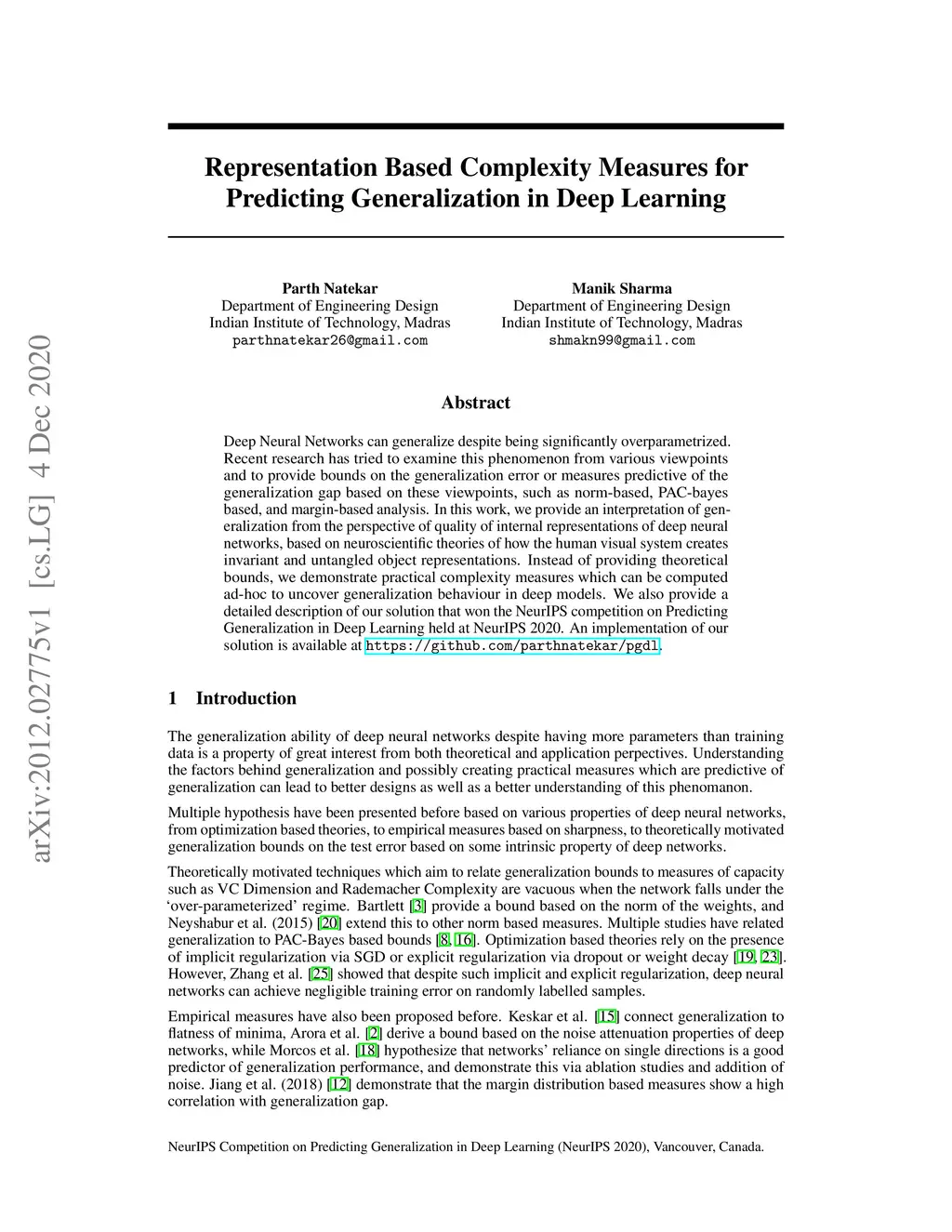 Deep Neural Networks can generalize despite being significantly overparametrized. Recent research has tried to examine this phenomenon from various view points and to provide bounds on the generalization error or measures predictive of the generalization gap based on these viewpoints, such as norm-based, PAC-Bayes based, and margin-based analysis. In this work, we provide an interpretation of generalization from the perspective of quality of internal representations of deep neural networks, based on neuroscientific theories of how the human visual system creates invariant and untangled object representations. Instead of providing theoretical bounds, we demonstrate practical complexity measures which can be computed ad-hoc to uncover generalization behaviour in deep models. We also provide a detailed description of our solution that won the NeurIPS competition on Predicting Generalization in Deep Learning held at NeurIPS 2020. An implementation of our solution is available at https://github.com/parthnatekar/pgdl.