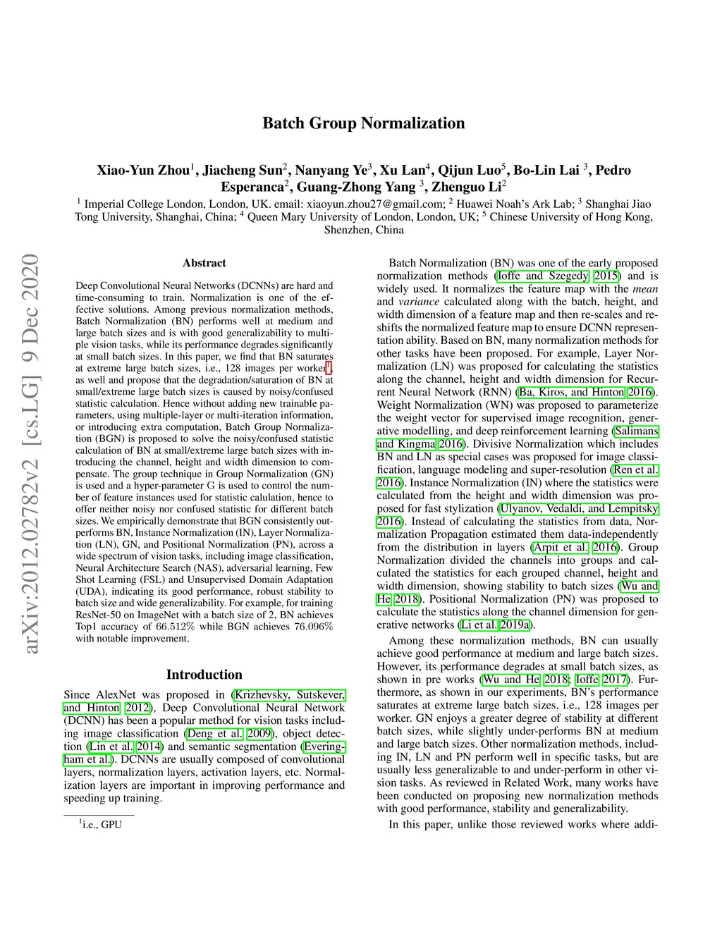 Deep Convolutional Neural Networks (DCNNs) are hard and time-consuming to train. Normalization is one of the effective solutions. Among previous normalization methods, Batch Normalization (BN) performs well at medium and large batch sizes and is with good generalizability to multiple vision tasks, while its performance degrades significantly at small batch sizes. In this paper, we find that BN saturates at extreme large batch sizes, i.e., 128 images per worker, i.e., GPU, as well and propose that the degradation/saturation of BN at small/extreme large batch sizes is caused by noisy/confused statistic calculation. Hence without adding new trainable parameters, using multiple-layer or multi-iteration information, or introducing extra computation, Batch Group Normalization (BGN) is proposed to solve the noisy/confused statistic calculation of BN at small/extreme large batch sizes with introducing the channel, height and width dimension to compensate. The group technique in Group Normalization (GN) is used and a hyper-parameter G is used to control the number of feature instances used for statistic calculation, hence to offer neither noisy nor confused statistic for different batch sizes. We empirically demonstrate that BGN consistently outperforms BN, Instance Normalization (IN), Layer Normalization (LN), GN, and Positional Normalization (PN), across a wide spectrum of vision tasks, including image classification, Neural Architecture Search (NAS), adversarial learning, Few Shot Learning (FSL) and Unsupervised Domain Adaptation (UDA), indicating its good performance, robust stability to batch size and wide generalizability. For example, for training ResNet-50 on ImageNet with a batch size of 2, BN achieves Top1 accuracy of 66.512% while BGN achieves 76.096% with notable improvement.
