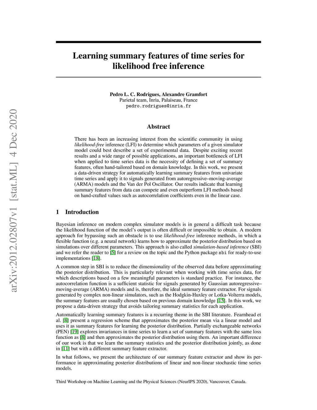 There has been an increasing interest from the scientific community in using likelihood-free inference (LFI) to determine which parameters of a given simulator model could best describe a set of experimental data. Despite exciting recent results and a wide range of possible applications, an important bottleneck of LFI when applied to time series data is the necessity of defining a set of summary features, often hand-tailored based on domain knowledge. In this work, we present a data-driven strategy for automatically learning summary features from univariate time series and apply it to signals generated from autoregressive-moving-average (ARMA) models and the Van der Pol Oscillator. Our results indicate that learning summary features from data can compete and even outperform LFI methods based on hand-crafted values such as autocorrelation coefficients even in the linear case.