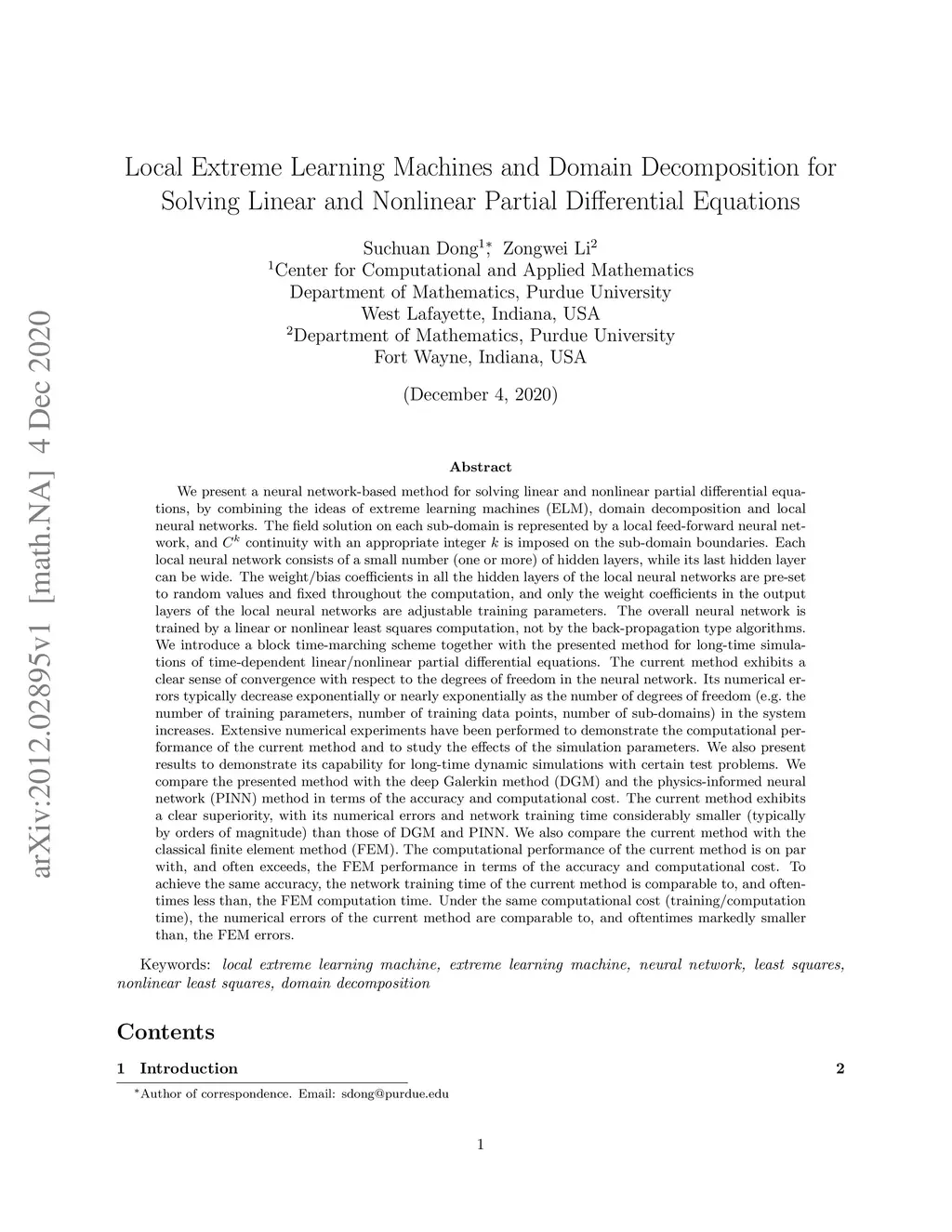 We present a neural network-based method for solving linear and nonlinear partial differential equations, by combining the ideas of extreme learning machines (ELM), domain decomposition and local neural networks. The field solution on each sub-domain is represented by a local feed-forward neural network, and continuity is imposed on the sub-domain boundaries. Each local neural network consists of a small number of hidden layers, while its last hidden layer can be wide. The weight/bias coefficients in all hidden layers of the local neural networks are pre-set to random values and are fixed, and only the weight coefficients in the output layers are training parameters. The overall neural network is trained by a linear or nonlinear least squares computation, not by the back-propagation type algorithms. We introduce a block time-marching scheme together with the presented method for long-time dynamic simulations. The current method exhibits a clear sense of convergence with respect to the degrees of freedom in the neural network. Its numerical errors typically decrease exponentially or nearly exponentially as the number of degrees of freedom increases. Extensive numerical experiments have been performed to demonstrate the computational performance of the presented method. We compare the current method with the deep Galerkin method (DGM) and the physics-informed neural network (PINN) in terms of the accuracy and computational cost. The current method exhibits a clear superiority, with its numerical errors and network training time considerably smaller (typically by orders of magnitude) than those of DGM and PINN. We also compare the current method with the classical finite element method (FEM). The computational performance of the current method is on par with, and oftentimes exceeds, the FEM performance.