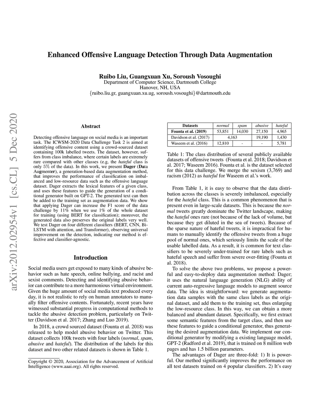 Detecting offensive language on social media is an important task. The ICWSM-2020 Data Challenge Task 2 is aimed at identifying offensive content using a crowd-sourced dataset containing 100k labelled tweets. The dataset, however, suffers from class imbalance, where certain labels are extremely rare compared with other classes (e.g, the hateful class is only 5% of the data). In this work, we present Dager (Data Augmenter), a generation-based data augmentation method, that improves the performance of classification on imbalanced and low-resource data such as the offensive language dataset. Dager extracts the lexical features of a given class, and uses these features to guide the generation of a conditional generator built on GPT-2. The generated text can then be added to the training set as augmentation data. We show that applying Dager can increase the F1 score of the data challenge by 11% when we use 1% of the whole dataset for training (using BERT for classification); moreover, the generated data also preserves the original labels very well. We test Dager on four different classifiers (BERT, CNN, Bi-LSTM with attention, and Transformer), observing universal improvement on the detection, indicating our method is effective and classifier-agnostic.