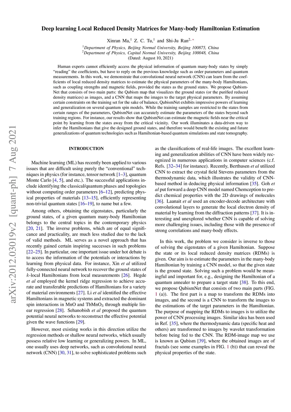 Human experts cannot efficiently access the physical information of quantum many-body states by simply "reading" the coefficients, but have to reply on the previous knowledge such as order parameters and quantum measurements. In this work, we demonstrate that convolutional neural network (CNN) can learn from the coefficients of local reduced density matrices to estimate the physical parameters of the many-body Hamiltonians, such as coupling strengths and magnetic fields, provided the states as the ground states. We propose QubismNet that consists of two main parts: the Qubism map that visualizes the ground states (or the purified reduced density matrices) as images, and a CNN that maps the images to the target physical parameters. By assuming certain constraints on the training set for the sake of balance, QubismNet exhibits impressive powers of learning and generalization on several quantum spin models. While the training samples are restricted to the states from certain ranges of the parameters, QubismNet can accurately estimate the parameters of the states beyond such training regions. For instance, our results show that QubismNet can estimate the magnetic fields near the critical point by learning from the states away from the critical vicinity. Our work illuminates a data-driven way to infer the Hamiltonians that give the designed ground states, and therefore would benefit the existing and future generalizations of quantum technologies such as Hamiltonian-based quantum simulations and state tomography.