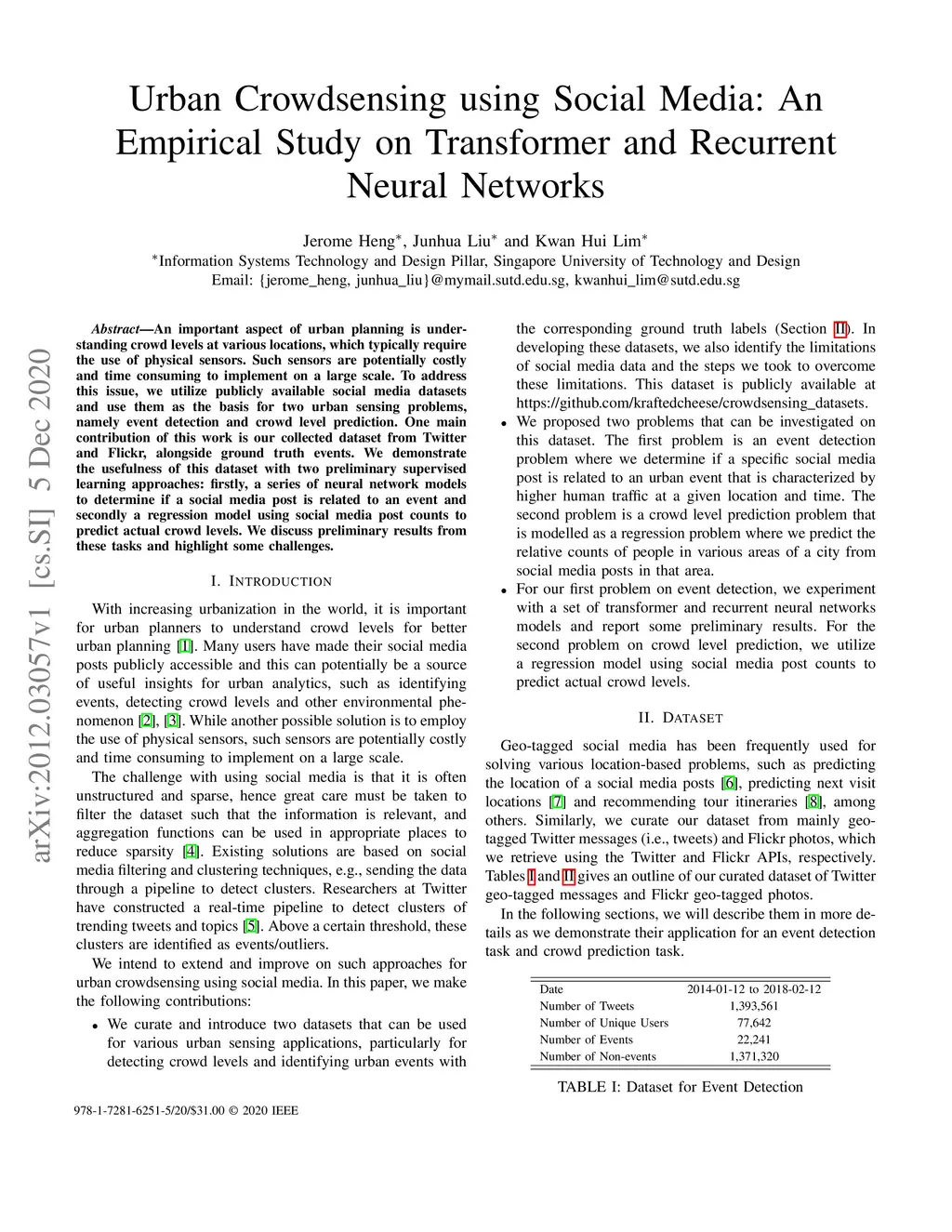 An important aspect of urban planning is understanding crowd levels at various locations, which typically require the use of physical sensors. Such sensors are potentially costly and time consuming to implement on a large scale. To address this issue, we utilize publicly available social media datasets and use them as the basis for two urban sensing problems, namely event detection and crowd level prediction. One main contribution of this work is our collected dataset from Twitter and Flickr, alongside ground truth events. We demonstrate the usefulness of this dataset with two preliminary supervised learning approaches: firstly, a series of neural network models to determine if a social media post is related to an event and secondly a regression model using social media post counts to predict actual crowd levels. We discuss preliminary results from these tasks and highlight some challenges.