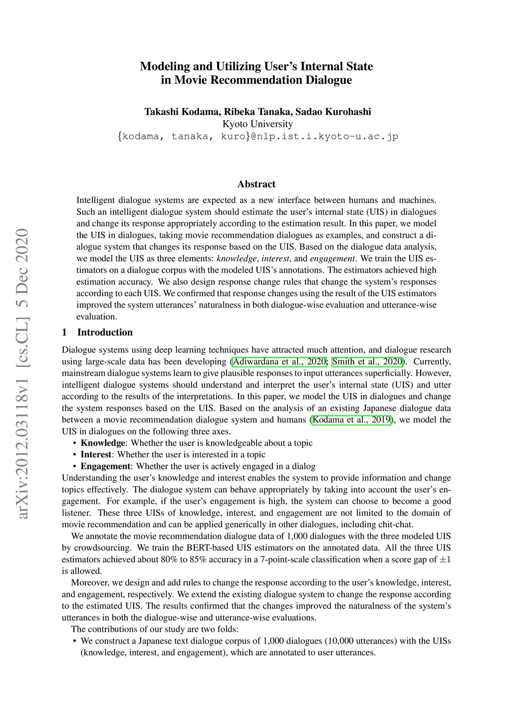 Intelligent dialogue systems are expected as a new interface between humans and machines. Such an intelligent dialogue system should estimate the user's internal state (UIS) in dialogues and change its response appropriately according to the estimation result. In this paper, we model the UIS in dialogues, taking movie recommendation dialogues as examples, and construct a dialogue system that changes its response based on the UIS. Based on the dialogue data analysis, we model the UIS as three elements: knowledge, interest, and engagement. We train the UIS estimators on a dialogue corpus with the modeled UIS's annotations. The estimators achieved high estimation accuracy. We also design response change rules that change the system's responses according to each UIS. We confirmed that response changes using the result of the UIS estimators improved the system utterances' naturalness in both dialogue-wise evaluation and utterance-wise evaluation.