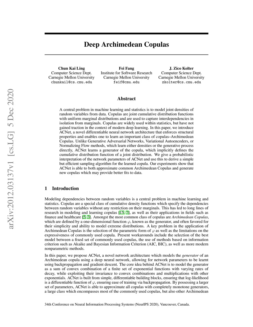 A central problem in machine learning and statistics is to model joint densities of random variables from data. Copulas are joint cumulative distribution functions with uniform marginal distributions and are used to capture interdependencies in isolation from marginals. Copulas are widely used within statistics, but have not gained traction in the context of modern deep learning. In this paper, we introduce ACNet, a novel differentiable neural network architecture that enforces structural properties and enables one to learn an important class of copulas--Archimedean Copulas. Unlike Generative Adversarial Networks, Variational Autoencoders, or Normalizing Flow methods, which learn either densities or the generative process directly, ACNet learns a generator of the copula, which implicitly defines the cumulative distribution function of a joint distribution. We give a probabilistic interpretation of the network parameters of ACNet and use this to derive a simple but efficient sampling algorithm for the learned copula. Our experiments show that ACNet is able to both approximate common Archimedean Copulas and generate new copulas which may provide better fits to data.