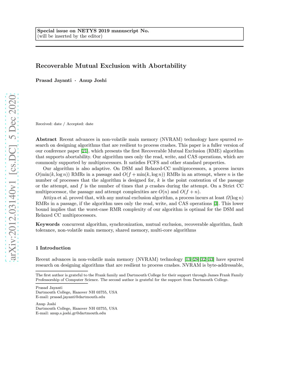 Recent advances in non-volatile main memory (NVRAM) technology have spurred research on designing algorithms that are resilient to process crashes. This paper is a fuller version of our conference paper \cite{jayanti:rmeabort}, which presents the first Recoverable Mutual Exclusion (RME) algorithm that supports abortability. Our algorithm uses only the read, write, and CAS operations, which are commonly supported by multiprocessors. It satisfies FCFS and other standard properties. Our algorithm is also adaptive. On DSM and Relaxed-CC multiprocessors, a process incurs RMRs in a passage and RMRs in an attempt, where is the number of processes that the algorithm is designed for, is the point contention of the passage or the attempt, and is the number of times that crashes during the attempt. On a Strict CC multiprocessor, the passage and attempt complexities are and . Attiya et al. proved that, with any mutual exclusion algorithm, a process incurs at least RMRs in a passage, if the algorithm uses only the read, write, and CAS operations \cite{Attiya:lbound}. This lower bound implies that the worst-case RMR complexity of our algorithm is optimal for the DSM and Relaxed CC multiprocessors.